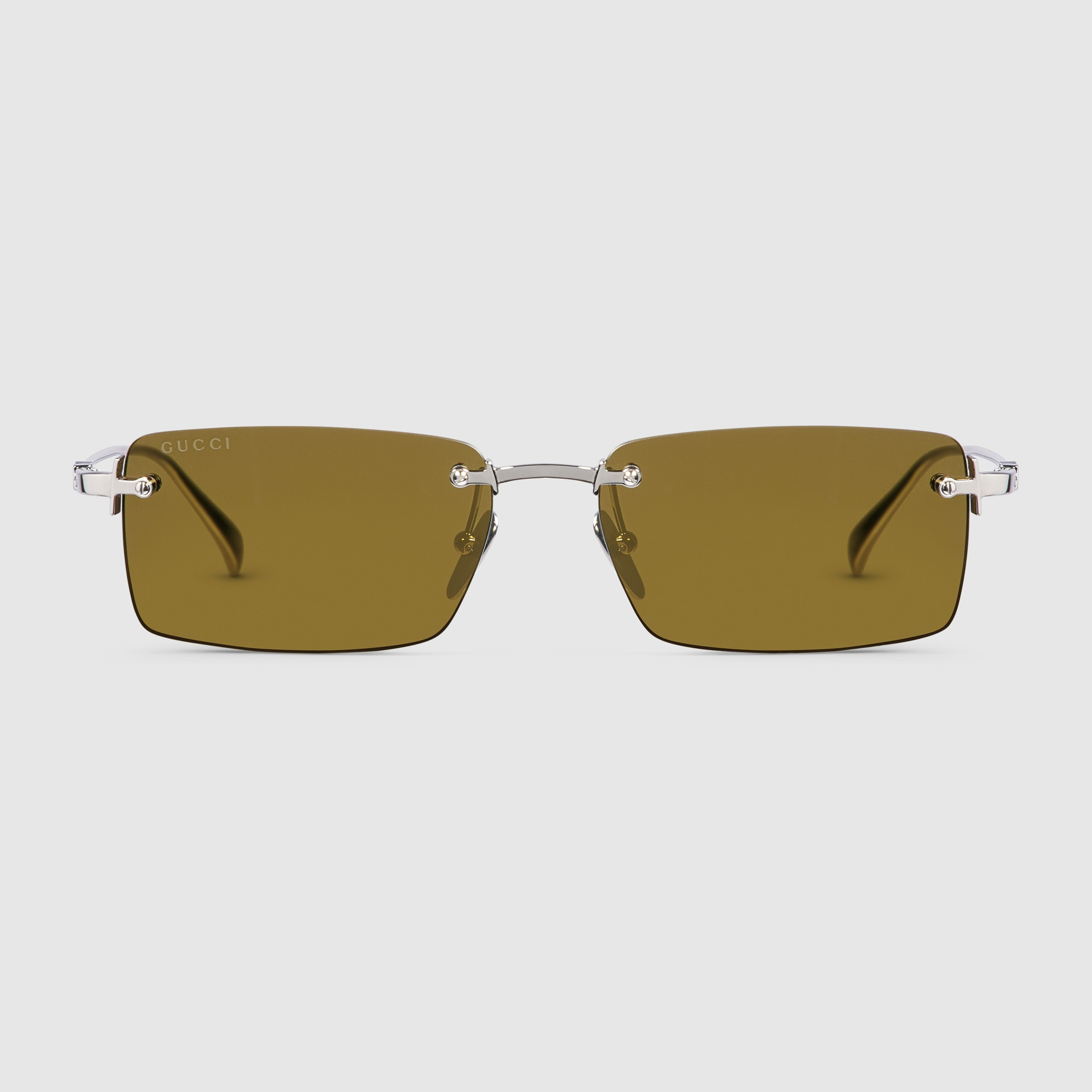 The Pre-Fall 2025 eyewear collection blends statement silhouettes from the archives with a contemporary touch. These rectangular frame sunglasses are stated in silver-toned metal with a cut-out Gucci logo. - Shiny silver-toned metal frames - Shiny silver-toned temples with cut-out Gucci logo - Solid brown lens - 100% UVA/UVB protection - GG1941S - Temple length: 5.5"; Lens height: 1.3", Nose bridge length: 0.6" - Frame height: 1.3"; Frame width: 5.5"; Hinge to hinge: 5.4" - The glasses will arrive in a velvet case, available in a range of six jewel-toned colors and paired with a coordinating satin lining. The case color will be individually selected for each pair of glasses and comes with a matching satin flannel pouch and ivory microfiber cloth.