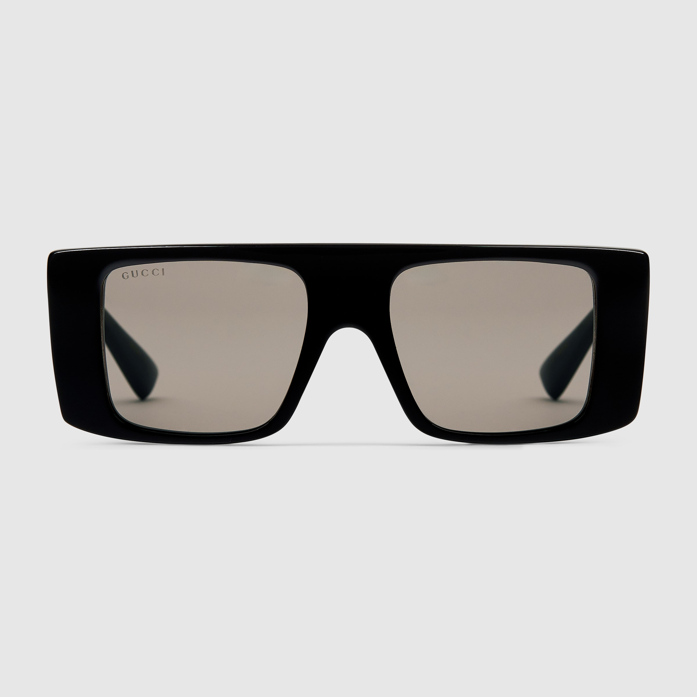 The Cruise 2025 eyewear collection blends a bold silhouette and subtle motifs in a contemporary design. These rectangular sunglasses feature wide temples, accentuated by a discreet Gucci logo and Web detail. - Shiny black acetate frame - Shiny black acetate temples with Gucci logo and Web detail - Solid grey lens - 100% UVA/UVB protection - GG1888S - Temple length: 5.5"; Lens height: 1.7"; Nose bridge length: 0.7" - Frame height: 1.9"; Frame width: 5.7"; Hinge to hinge: 5" - Made in Italy - The eyewear case in the House’s signature Gucci Rosso Ancora red hue is complete with a magnetic closure and white interior.