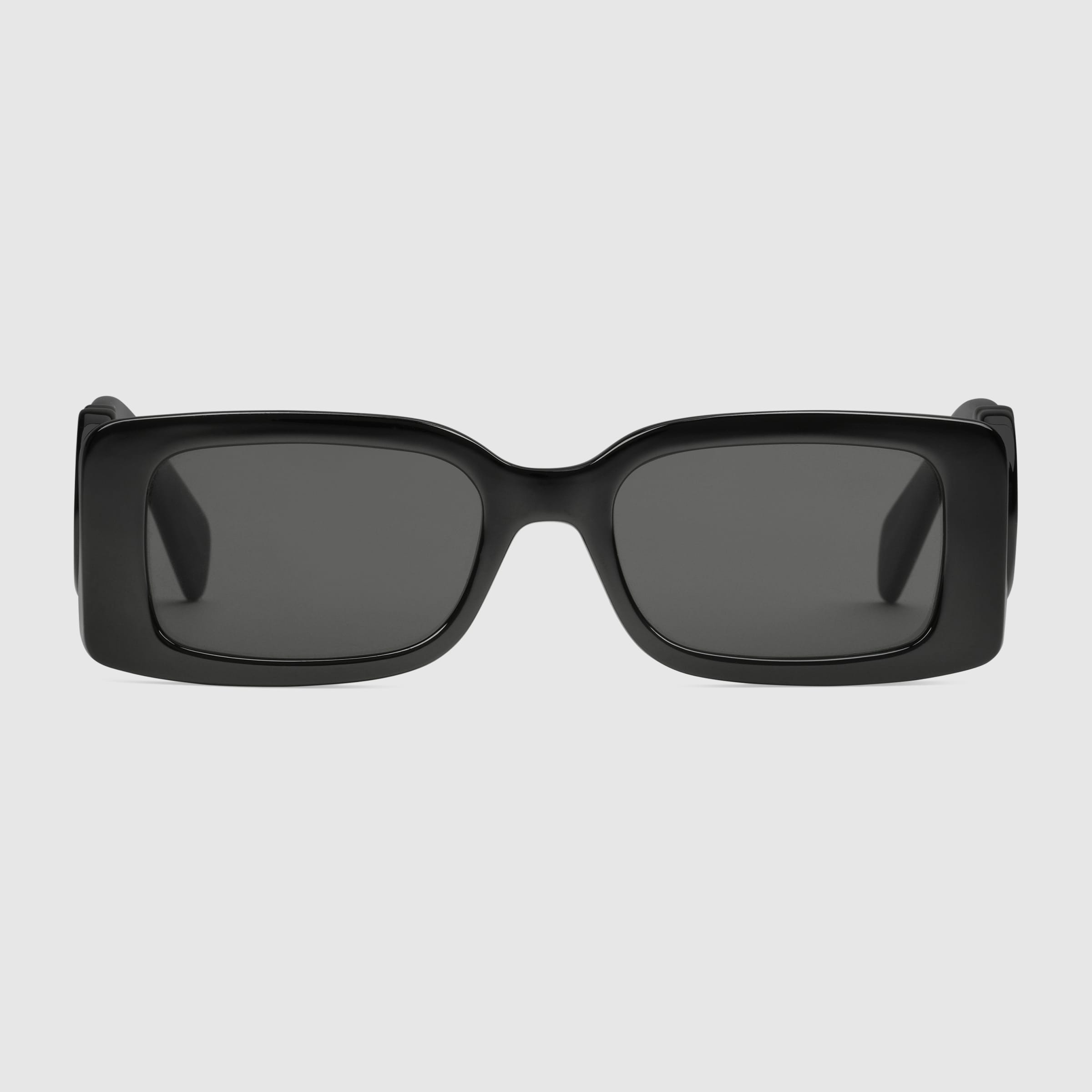 A bold black acetate structure defines these rectangular-frame sunglasses, resulting in a modern final design. A cut-out Interlocking G logo enriches the temples. - Shiny black acetate frame - Shiny black acetate temples with cut-out Interlocking G - Solid grey lens - 100% UVA/UVB protection - Frame height: 1.7"; Frame Width: 5.8" - GG1325S - Temple length: 5.5"; Lens height: 1.3", Nose bridge length: .7" - The glasses will arrive in a velvet case, available in a range of six jewel-toned colors and paired with a coordinating satin lining. The case color will be individually selected for each pair of glasses and comes with a matching satin flannel pouch and ivory microfiber cloth.