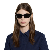 The Pre-Fall 2025 eyewear collection blends a sleek silhouette and signature motifs in a contemporary design. These rectangular sunglasses feature an engraved Gucci logo on metal plaque across the black injection temples. - Matte black injection frames - Matte black injection temples with engraved Gucci logo on metal plaque - Solid grey lens - 100% UVA/UVB protection - GG2011S - Temple length: 4.5"; Lens height: 1.6"; Nose bridge length: 0.5" - Frame height 1.7"; Frame width 5.6"; Hinge to hinge 5.3" - Made in Italy - The soft black pouch is complete with an elastic drawstring, the Gucci logo and Interlocking G details.