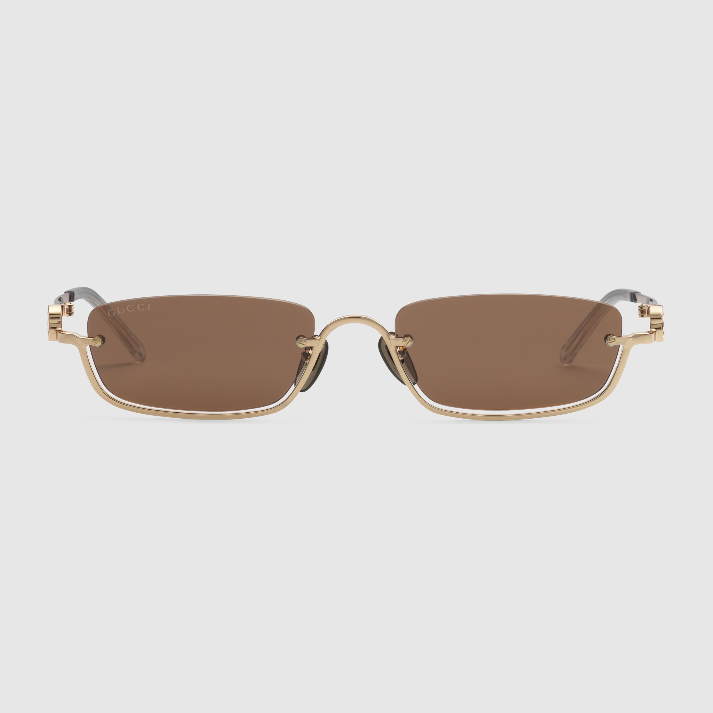 A pair of rectangular-frame sunglasses crafted in gold-toned metal frame and solid brown lenses. The distinctive Interlocking G detail continues to be a distinguishing feature of Gucci's collections and appears along the temples. - Shiny gold-toned metal frame - Shiny gold-toned metal temples with cut-out Interlocking G and acetate tips - Solid brown lens - 100% UVA/UVB protection - Frame height: 1.1"; Frame Width: 5.7" - GG1278S - Temple length: 5.5"; Lens height: 1.1", Nose bridge length: .7" - The glasses will arrive in a velvet case, available in a range of six jewel-toned colors and paired with a coordinating satin lining. The case color will be individually selected for each pair of glasses and comes with a matching satin flannel pouch and ivory microfiber cloth.