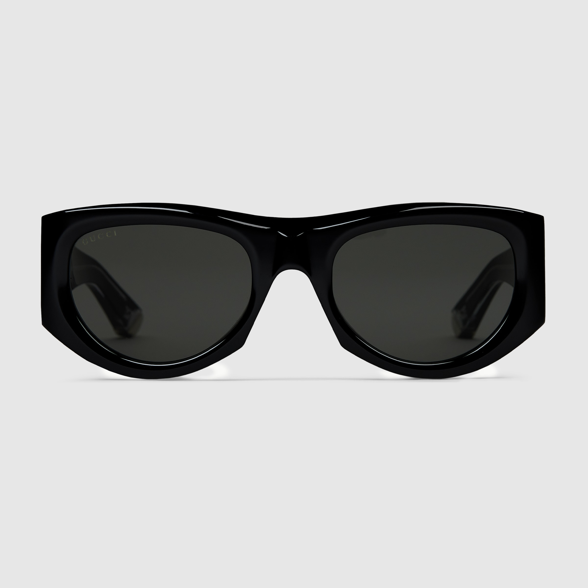 These stylish rectangular-frame sunglasses are distinguished by their glossy black acetate construction, featuring the iconic Gucci logo elegantly displayed on the temples. Complemented by solid grey lenses, they offer a perfect fusion of contemporary design and classic luxury. - Shiny black acetate frame - Shiny black acetate temples with Gucci logo - Solid grey lens - 100% UVA/UVB protection - GG1917S - Temple length: 5.51"; Lens height: 1.57"; Nose bridge length: 0.83" - Frame height: 1.9"; Frame width: 5.7" - Made in Italy - The Rosso Ancora packaging, a distinctive color chosen by Creative Director Sabato De Sarno to mark the beginning of Gucci's new creative chapter, includes a vinyl case and satin pouch.
