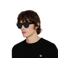 The Pre-Fall 2025 eyewear collection presents sleek silhouettes with the signature Web stripe at the temples. These rectangular sunglasses are stated in black acetate with a Web detail and engraved Gucci logo on a metal plaque across the temples. - Shiny black acetate frames - Shiny black acetate temples with Web detail and engraved Gucci logo on metal plaque - Solid grey lens - 100% UVA/UVB protection - GG1960S - Temple length: 5.7"; Lens height: 1.6", Nose bridge length: 0.6" - Frame height: 1.8"; Frame width: 5.6"; Hinge to hinge: 5.2" - The glasses will arrive in a velvet case, available in a range of six jewel-toned colors and paired with a coordinating satin lining. The case color will be individually selected for each pair of glasses and comes with a matching satin flannel pouch and ivory microfiber cloth.