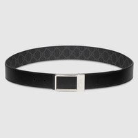 Men's belts with reversible rectangular buckle feature the House's signature motif on one side and leather on the other in neutral shades. Stated in a GG Supreme and smooth leather, it's defined by a rectangular buckle with Gucci engraving detail. - Black GG Supreme on one side and black leather on the other - Palladium-toned hardware - Rectangular buckle with Gucci engraving - Detachable buckle - 1.3" width - Made in Italy - Can be worn as a hip or waist belt. Sizing will differ based on where the belt is worn, please refer to the size guide to find your size.