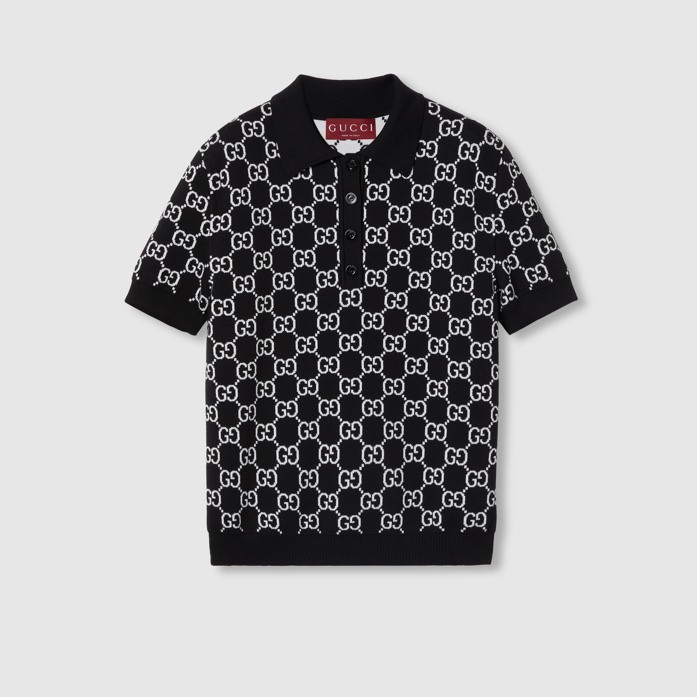 Taking inspiration from founder Guccio Gucci's monogram, the GG motif continues to be a firm favorite of the House. This reversible polo is stated in a fine wool tubular GG jacquard stitch and completed with a contrast rib trim. - Black and white reversible fine wool tubular GG jacquard stitch - Polo collar - Short sleeves - Contrast rib trim - Button closure - Length: 21.6"; based on a size S - Made in Italy - The model is 5'9" and is wearing size small