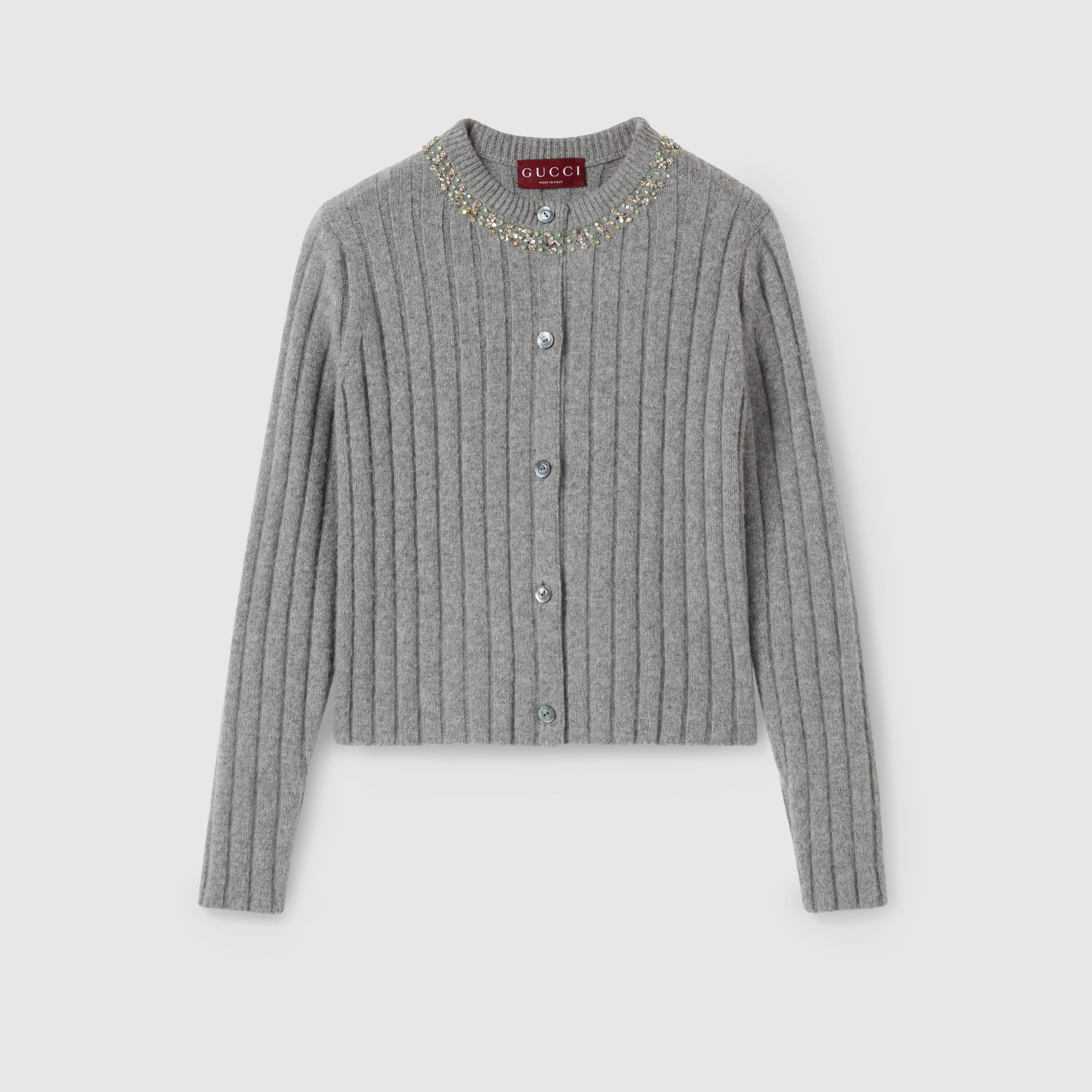 In the Fall Winter 2025 collection, tactile yarns and luminous accents elevate essential knitwear shapes. This cardigan is crafted in a ribbed knit and embellished with crystal embroidery along the neckline. - Grey wide rib soft wool and cashmere - Crystal embroidered collar - Crewneck - Long sleeves - Open front - Length: 21.7"; based on size S - Made in Italy