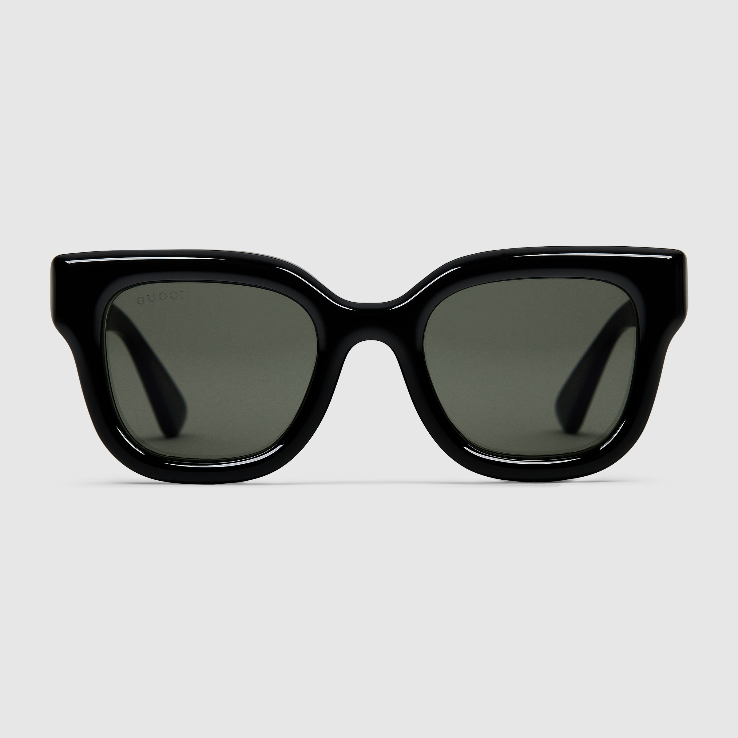 The Cruise 2025 eyewear collection blends a rounded silhouette and signature motifs in an inspired design. These sunglasses feature a well-proportioned frame and Double G detail on the temples. - Shiny black injection frame - Shiny black injection temples with Double G detail - Solid grey lens - 100% UVA/UVB protection - GG1828S - Temple length: 5.7"; Lens height: 1.6"; Nose bridge length: 0.9" - Frame height: 2"; Frame width: 5.6"; Hinge to hinge: 4.8" - Made in Italy - The eyewear case in the House’s signature Gucci Rosso Ancora red hue is complete with a magnetic closure and white interior.