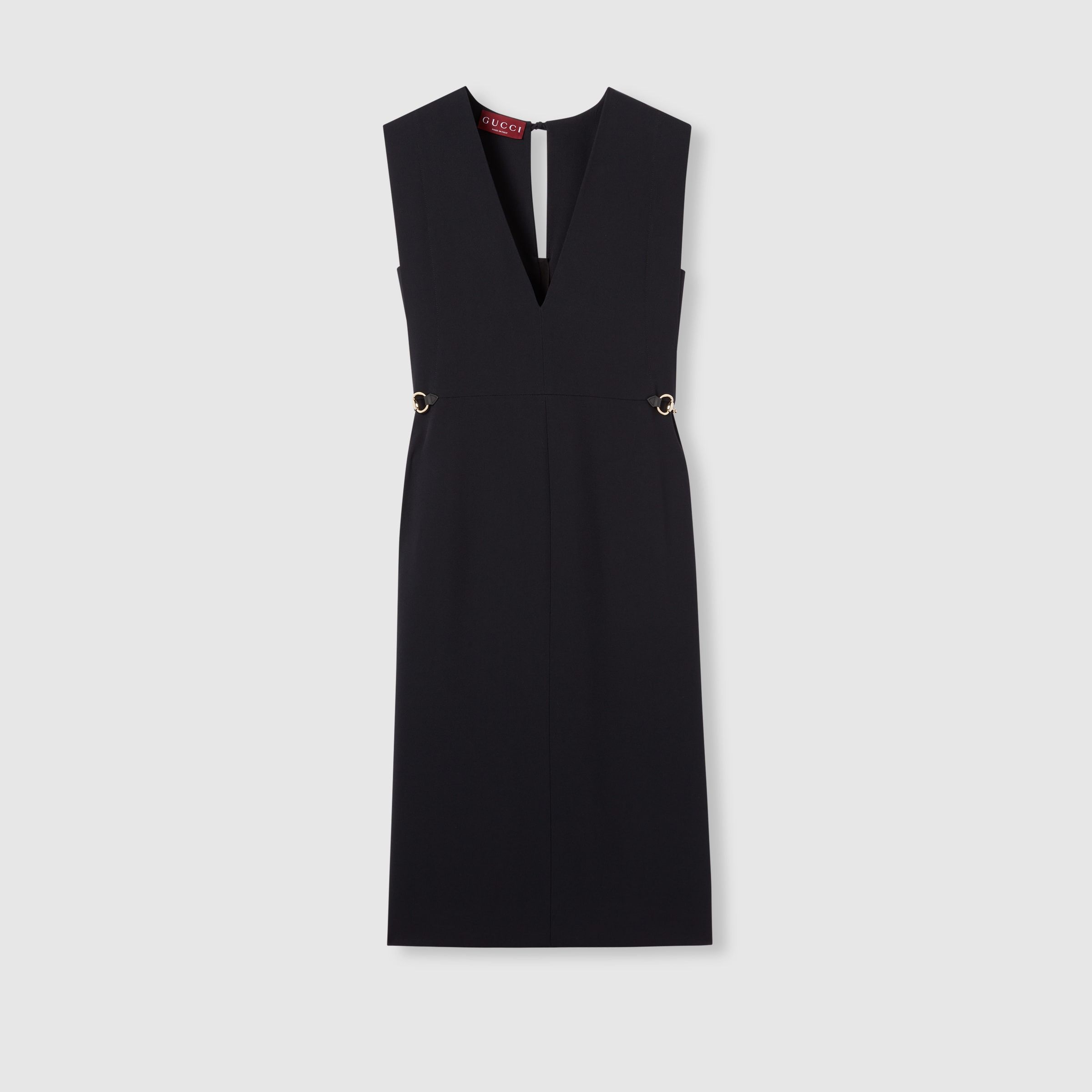 From light to deep shades, elegant pieces crafted from refined materials highlight sensual silhouettes, elevating the Pre-fall 2025 collection. This viscose satin dress has a V-neckline and is defined by the Horsebit detail, a reference to the House's equestrian heritage. - Black viscose satin - Unlined - Horsebit detail - V-neck - Sleeveless - Back slit - Tie ribbon and zip closure - Made in Italy