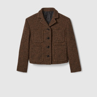 In the Fall Winter 2025 collection, utility codes are refined through precise cuts and compact proportions. This cropped jacket features a peak lapel, four front patch pockets with flaps and a button-up front. Half lined. - Dark brown and black seeded wool with a textured appearance - Gucci horn buttons - Half lined - Peak lapel - Four front patch pockets - Button closure - Length: 18.9"; based on size 38 IT - Made in Italy