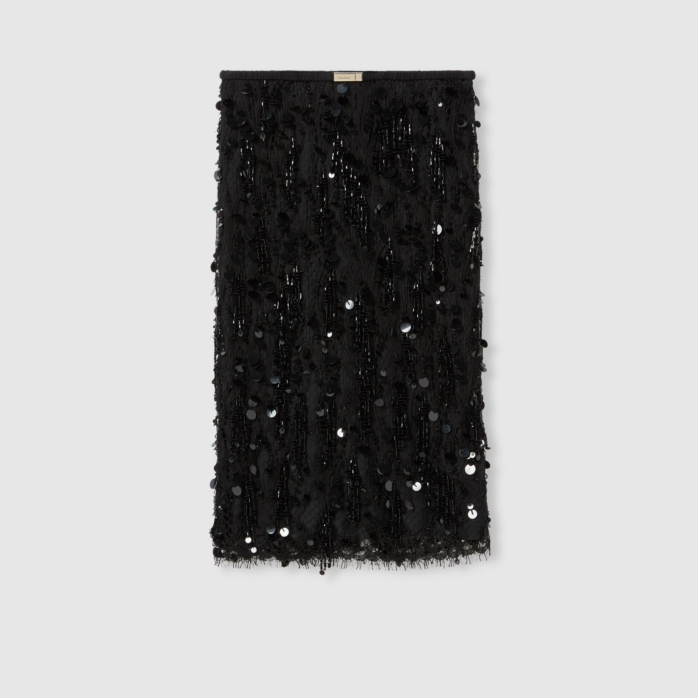 In the Fall Winter 2025 collection, this skirt is enriched with embroidered motifs and a metal Gucci buckle at the waist. The style comes with a detachable lining and is completed by a back slit and zip closure. - Black wave embroidered lace - Sequin embroidery - Detachable lining - Ruched elastic waist with metal Gucci buckle - Back slit - Length: 23.6"; based on a size 38 (IT) - Made in Italy