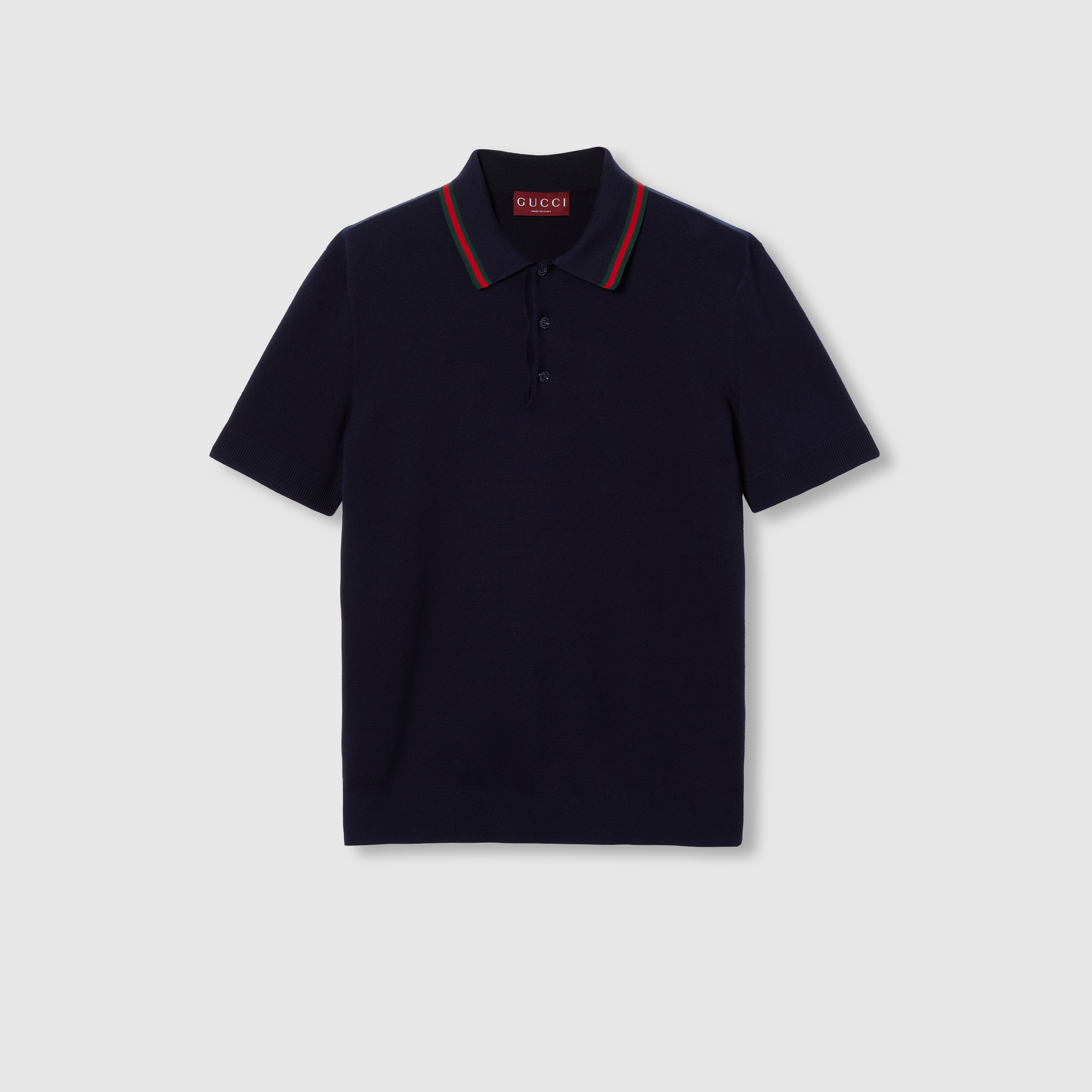 Gucci's House codes continue to evolve for the new season across jersey pieces. This polo shirt is presented in a silk cotton knit and enriched with a green and red Web trim and Gucci intarsia. - Navy silk cotton knit - Green and red Web trim - Gucci intarsia - Polo collar - Dropped shoulder - Short sleeves - Rib trim - Button closure - Length: 26.2"; Shoulder: 17.7"; Chest: 20.9"; Sleeves length: 9.8"; based on a size M - Made in Italy - The product shown in this image is a size medium