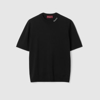 The Pre-Fall 2025 collection spotlights essential silhouettes with emblematic details from daywear to eveningwear. This T-shirt is made from black silk cotton knit and decorated with a Gucci intarsia. - Black silk cotton knit - Gucci intarsia - Crewneck - Short sleeves - Rib trim - Length: 25.6"; Shoulder: 16.9"; Chest: 20.1"; Sleeves length: 11"; based on a size M - Made in Italy