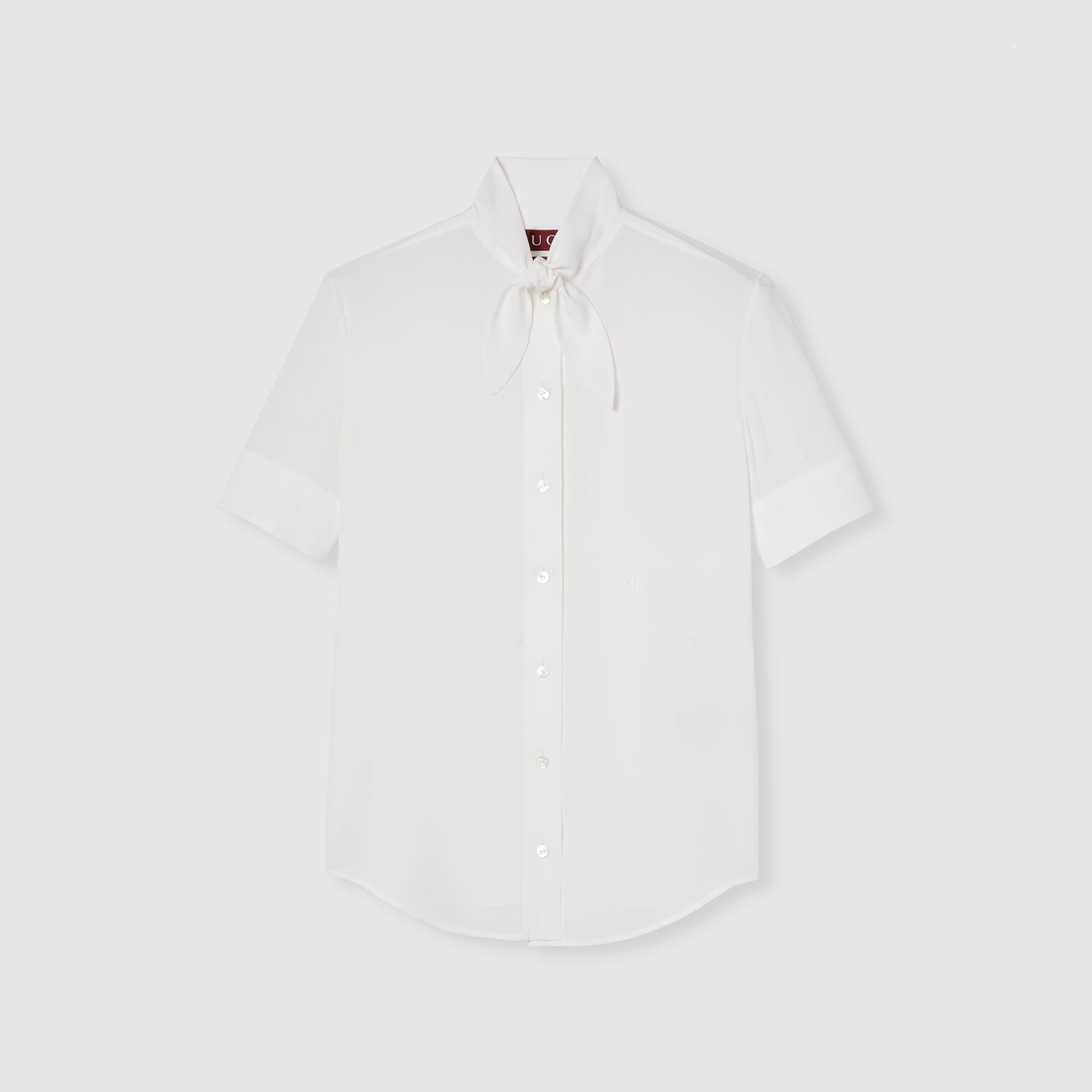 A monochrome palette with subtle details, such as embroideries or logo hardware, transitions the wardrobe from day to night in a selection of pieces from the Pre-Fall 2025 collection. This silk crepe de chine shirt features a self-tie ribbon at the neck and is complete with a subtle Double G embroidery. - White silk crepe de chine - Double G embroidery - Unlined - High neck with self-tie ribbon - Short sleeves - Button closure - Made in Italy