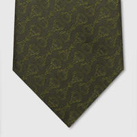 The House's silk accessories collection continues to reinterpret emblematic motifs, from the GG, Web, Flora, bamboo, Horsebit and equestrian inspirations, in sumptuous materials, intricate craftsmanship, and fresh hues. Cut from a Horsebit silk jacquard, this striking tie champions emblems from the archives. - Green Horsebit silk jacquard - Gucci bee label on the back - 2.75”W x 57.5”L - Main fabric: silk 100%; lining: cupro 60%, silk 40%;