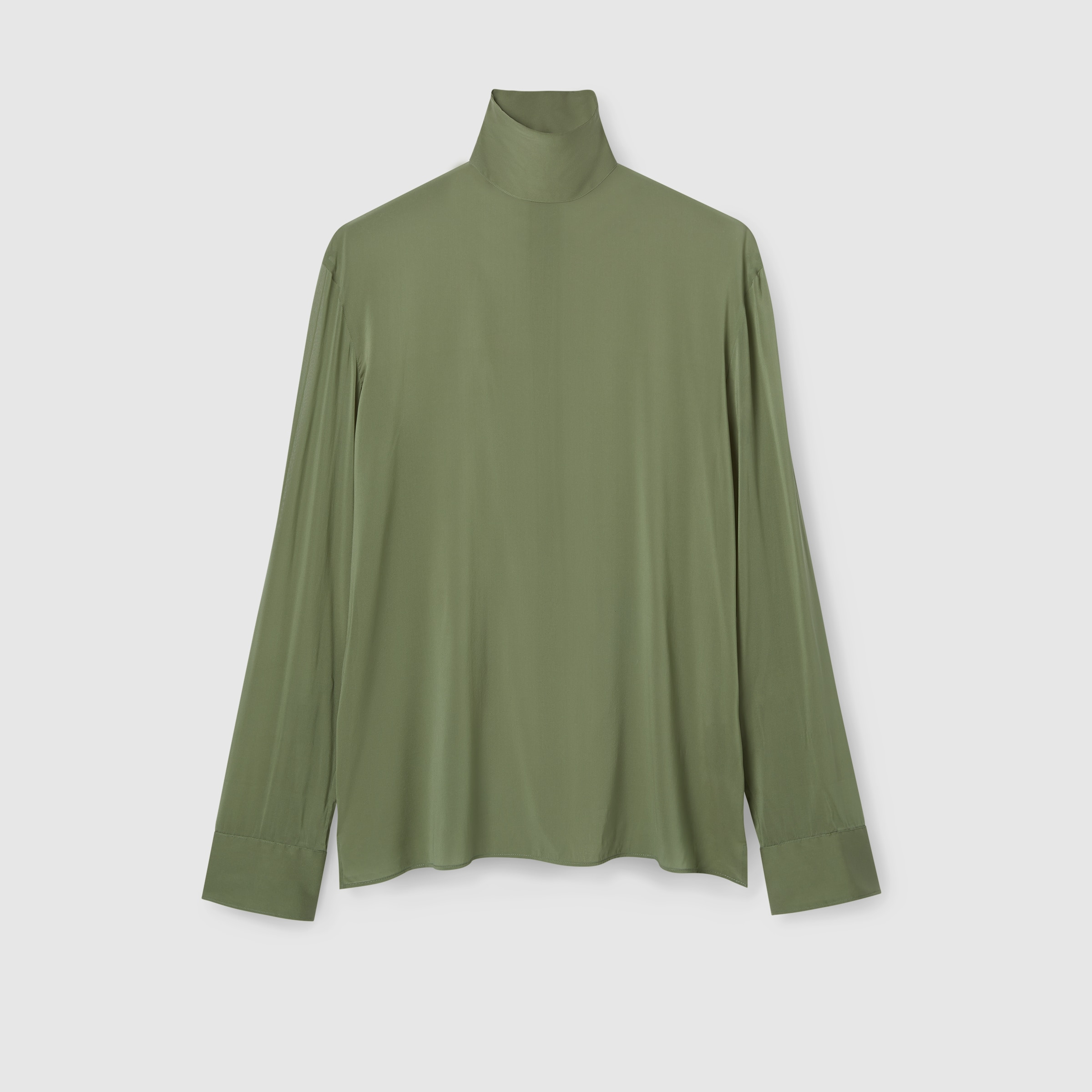 In the Fall Winter 2025 collection, tailoring is reimagined with unexpected ease. A modern take on a classic design, this shirt is characterized by its clean construction and distinctive back closure. The concealed button placket and buttoned cuffs enhance the minimal silhouette, offering a refined, contemporary look. - Forest green silk stretch chiffon - Stand collar - Long sleeves - Buttoned cuffs - Covered button closure at the back - Regular fit - Total length: 27.9"; Shoulder: 18.7"; Chest: 20"; Sleeve length: 25.5"; (size 46 IT) - Made in Italy