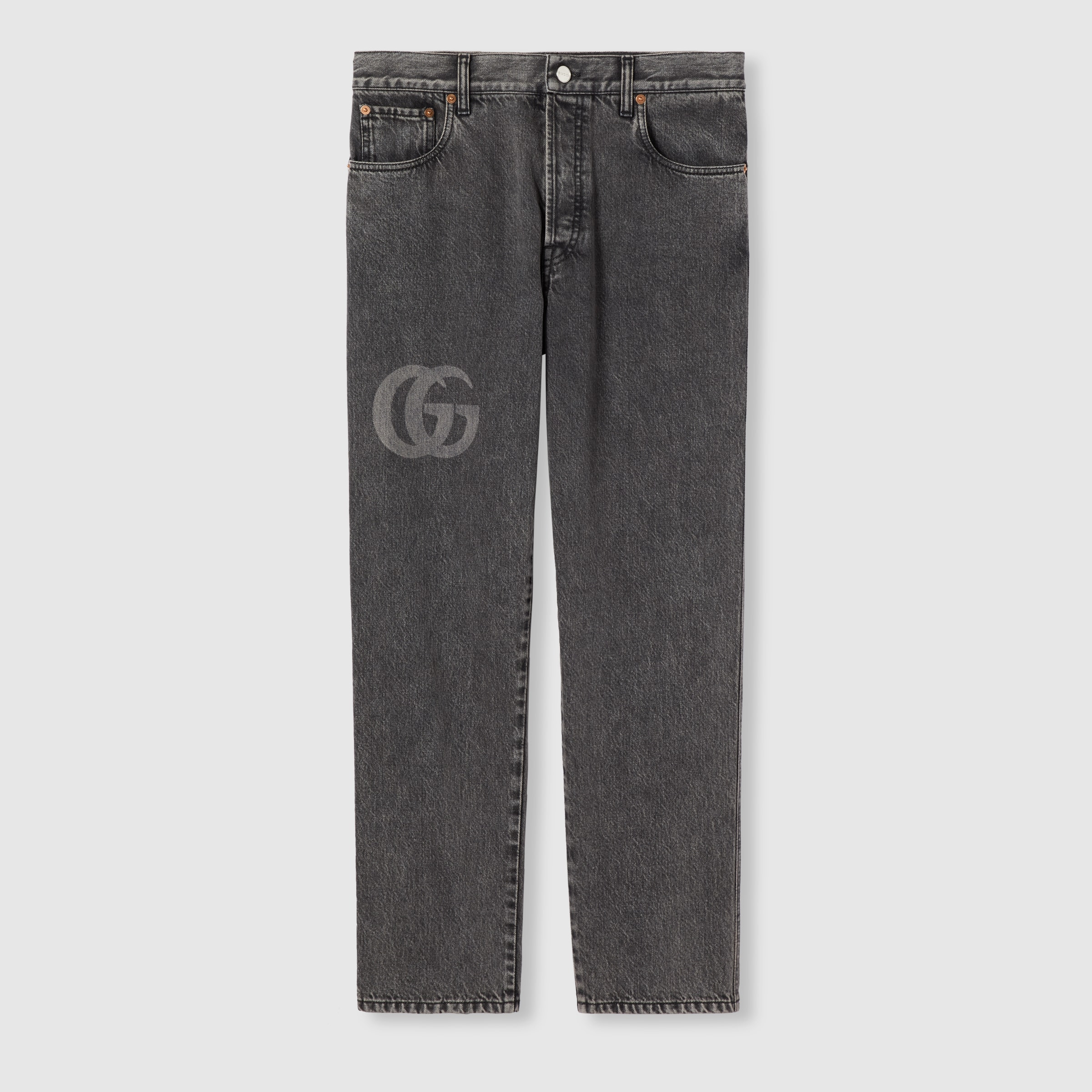 For the Pre-Fall 2025 collection, denim pieces with subtle details elevate everyday looks. Cut from a grey washed cotton denim, these slim fit pants are defined by a Double G lasered detail and a Gucci jacron label. - Grey washed cotton denim - Double G lasered detail - Gucci jacron label - Five-pocket style - Cropped - Button and zip fly closure - Slim fit - Total length: 40.6"; Waist: 17.3"; Hips: 20.1"; Hem width: 7.9"; based on a size 34 - Made in Italy