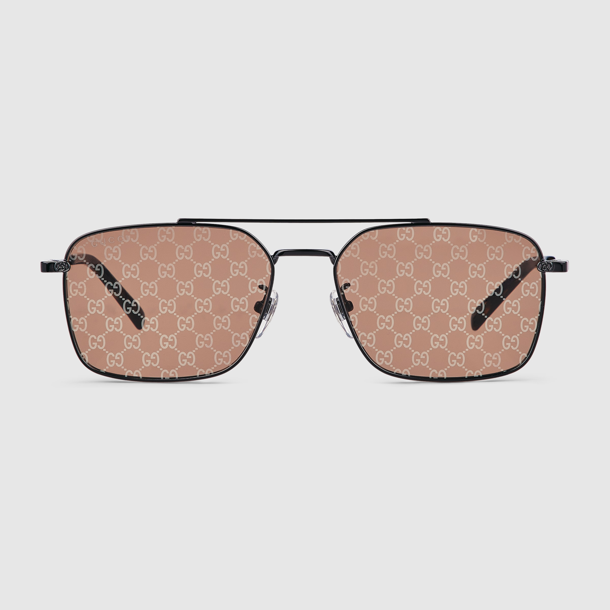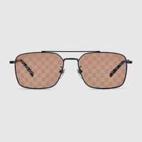 The Pre-Fall 2025 eyewear collection successfully combines the coveted silhouettes of bygone decades with a contemporary logo feel. Here, this dark grey metal frame pairs with an Interlocking G and engraved Gucci logo. - Shiny dark grey metal frames with Interlocking G detail - Shiny dark grey metal temples with engraved Gucci logo - Brown mirrored Guccissima lens - 100% UVA/UVB protection - GG1957SA - Temple length: 5.7"; Lens height: 1.6", Nose bridge length: 0.6" - Frame height: 1.7"; Frame width: 5.7"; Hinge to hinge: 5.4" - The glasses will arrive in a velvet case, available in a range of six jewel-toned colors and paired with a coordinating satin lining. The case color will be individually selected for each pair of glasses and comes with a matching satin flannel pouch and ivory microfiber cloth.