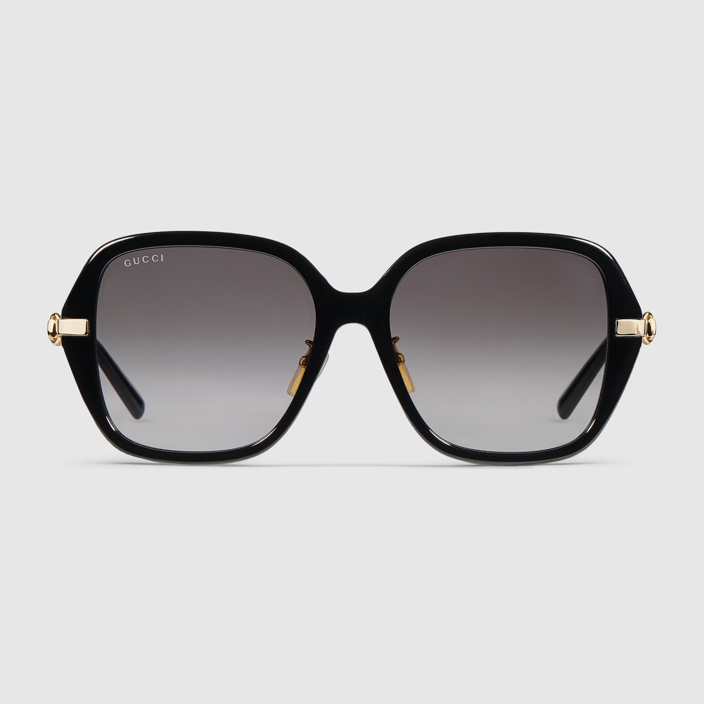 In the Fall Winter 2025 collection, the House celebrates its longstanding equestrian heritage. These sunglasses reveal a through-Horsebit detail and gradient grey lenses. - Shiny black acetate frame - Shiny gold-toned metal temples with through-Horsebit detail and black acetate end tips - Gradient grey lens - 100% UVA/UVB protection - GG2055SA - Temple length: 5.7"; Lens height: 2"; Nose bridge length: 0.6" - Frame height: 2.3"; Frame width: 5.8"; Hinge to hinge: 5.6" - Made in Japan - The eyewear case in the House’s signature Rosso Ancora red hue is complete with a magnetic closure and white interior