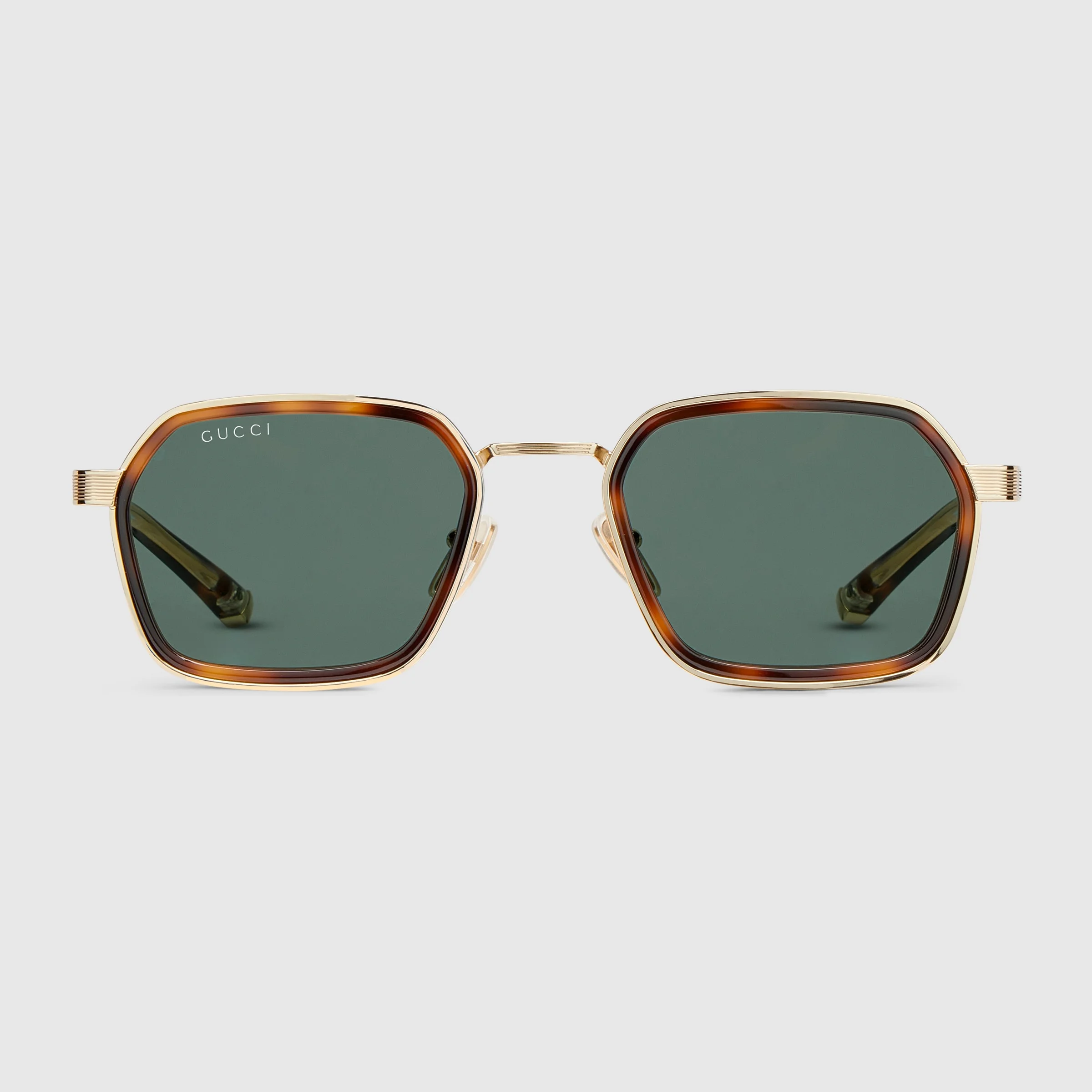 The House's eyewear collection continues to reinterpret emblematic motifs, from the GG, Web, bamboo, Horsebit and equestrian inspirations, in sumptuous materials, intricate craftsmanship, and fresh hues. These square frame sunglasses are presented in dark brown tortoiseshell acetate and shiny light gold-toned metal, revealing a double-construction. - Double-constructed dark brown tortoiseshell acetate and shiny light gold-toned metal frame - Double-constructed dark brown tortoiseshell acetate and shiny light gold-toned metal temples with see-through acetate detail and Gucci logo - Solid green lens - 100% UVA/UVB protection - Adjustable nose pads - GG2074S - Temple length: 5.7"; Lens height: 1.5"; Nose bridge length: 0.8" - Frame height: 5.5"; Frame width: 1.6"; Hinge to hinge: 5" - Made in Italy - The eyewear case in black is complete with a magnetic closure and GG motif interior.