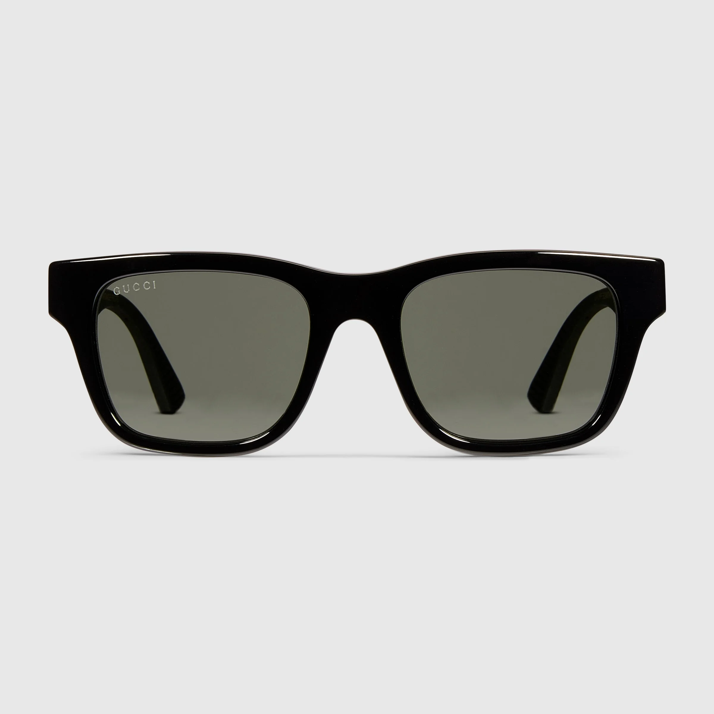 The House's eyewear collection continues to reinterpret emblematic motifs, from the GG, Web, bamboo, Horsebit and equestrian inspirations, in sumptuous materials, intricate craftsmanship, and fresh hues. These square frame sunglasses are stated in black acetate with rubber temples and are enriched with an enameled Web and metal plaque near the hinge. - Shiny black acetate frame - Black rubber temples with enameled Web and metal plaque near the hinge - Grey lens - 100% UVA/UVB protection - GG2089S - Temple length: 5.7"; Lens height: 1.6"; Nose bridge length: 0.7" - Frame height: 5.7"; Frame width: 1.8"; Hinge to hinge: 5.2" - The eyewear case in the House’s signature Rosso Ancora red hue is complete with a magnetic closure and white interior