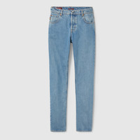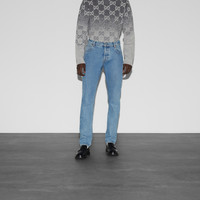 The Web is being reenvisioned as patterns and unique details through complex constructions and stitching techniques that elevate knitwear and more pieces from mere sportswear to iconic masterpieces. These tapered jeans are made from a blue washed denim and feature a Web loop detail as well as a Gucci Rosso Ancora naplak label. - Blue washed denim - Green and red Web loop detail - Gucci Rosso Ancora naplak label - Belt loops - Five pocket construction - Waist: 16.9"; based on a size 32 - Hips: 19.4"; based on a size 32 - Hem width: 6.8"; based on a size 32 - Button and zip closure - Tapered fit - Length: 41.3" based on a size 32 - Leg opening: 7"; based on a size 32 - Made in Italy - The product shown in the image is a size 32 (IT)