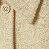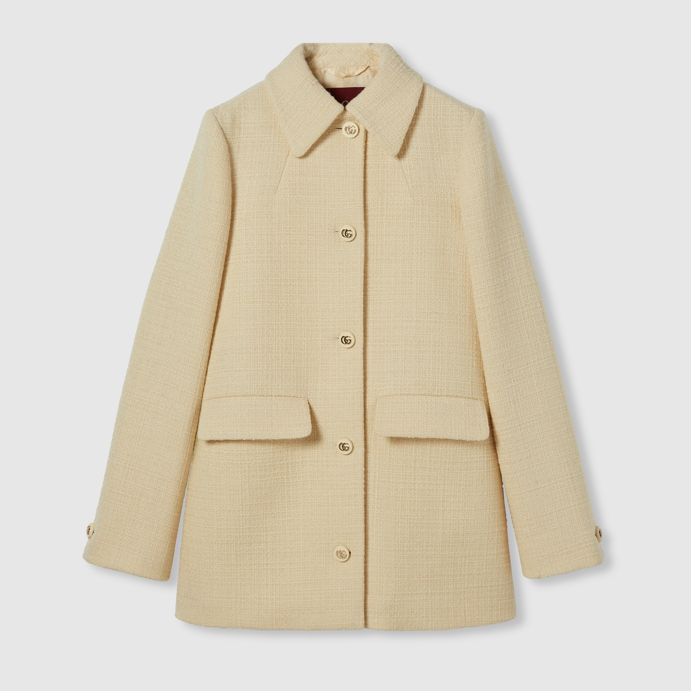 Coats, jackets, and dresses blend discreet elegance with refined details in the Pre-Fall 2025 collection. This coat appears in textured wool tweed with a bon-ton feel. Gold-toned Double G buttons and a martingale back add to the elegance of the piece. - Ivory textured wool tweed - Gold-toned and self-covered Double G buttons - Lined - Point collar - Two front flap pockets - Martingale belt - Button closure - Made in Italy
