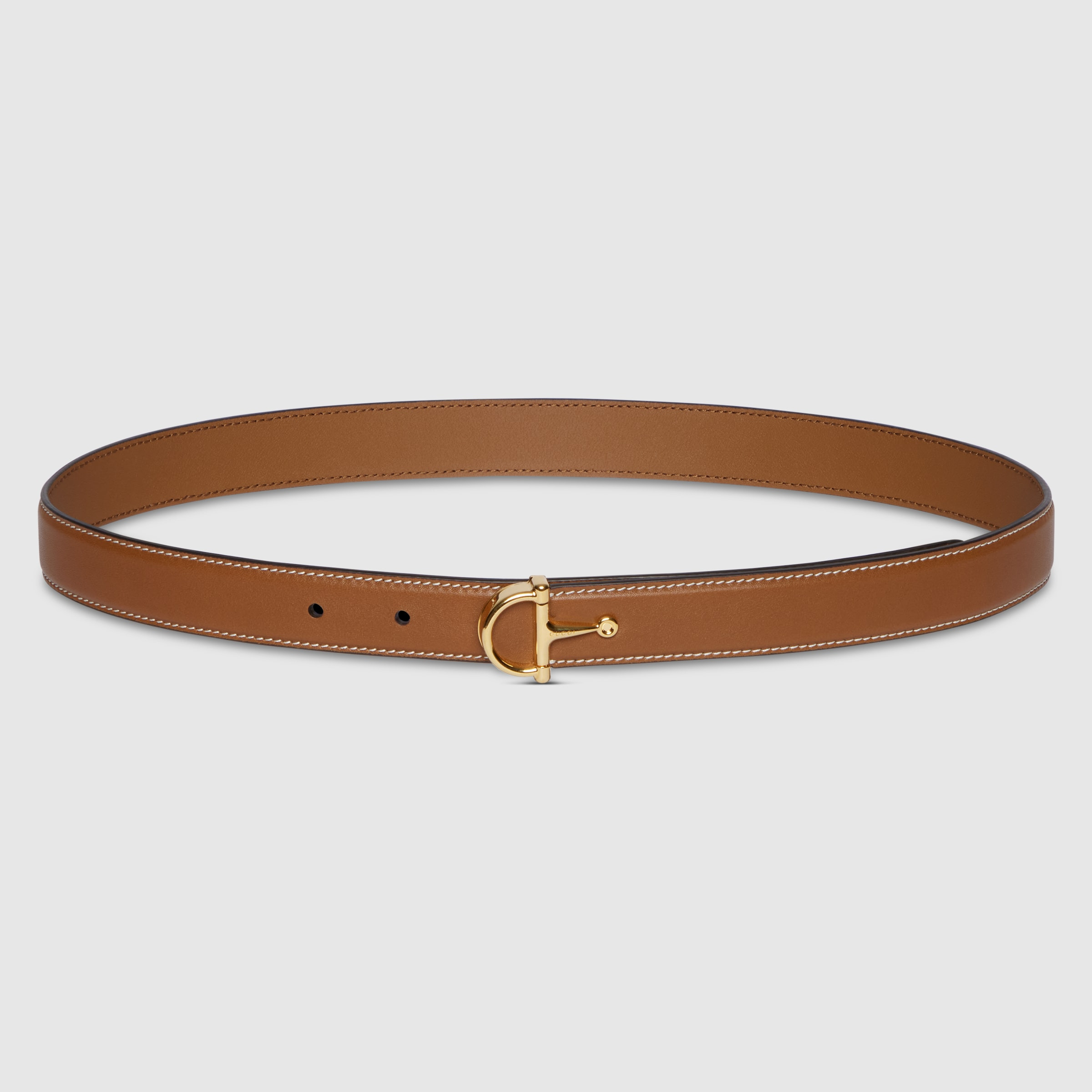 The maxi half Horsebit adorns a selection of women's belts, reinterpreting the House's equestrian-inspired hardware. This thin belt is presented in a brown leather with a light gold-toned half-Horsebit buckle. - Brown smooth leather - Light gold-toned hardware - Half-Horsebit buckle - 0.9" width - Made in Italy - Can be worn as a hip or waist belt. Sizing will differ based on where the belt is worn, please refer to the size guide to find your size.