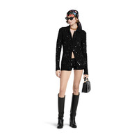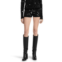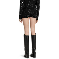 Introducing new knitwear styles, sophisticated yarn provides volume, and is further elevated through artisanal details which highlight rich textures. With a new focus on yarns, these knits can be worn alone as a standout piece, or layered to complement the Fall Winter 2024 wardrobe. These viscose tweed blend shorts feature an allover sequin embroidery. - Black fine tweed viscose - Allover sequin embroidery - Elastic waist - Rib trim - Length: 8.2" - Made in Italy - Fabric: 51% Viscose, 30% Polyamide, 18% Wool, 1% Elastane - Sequins: 100% Polyester