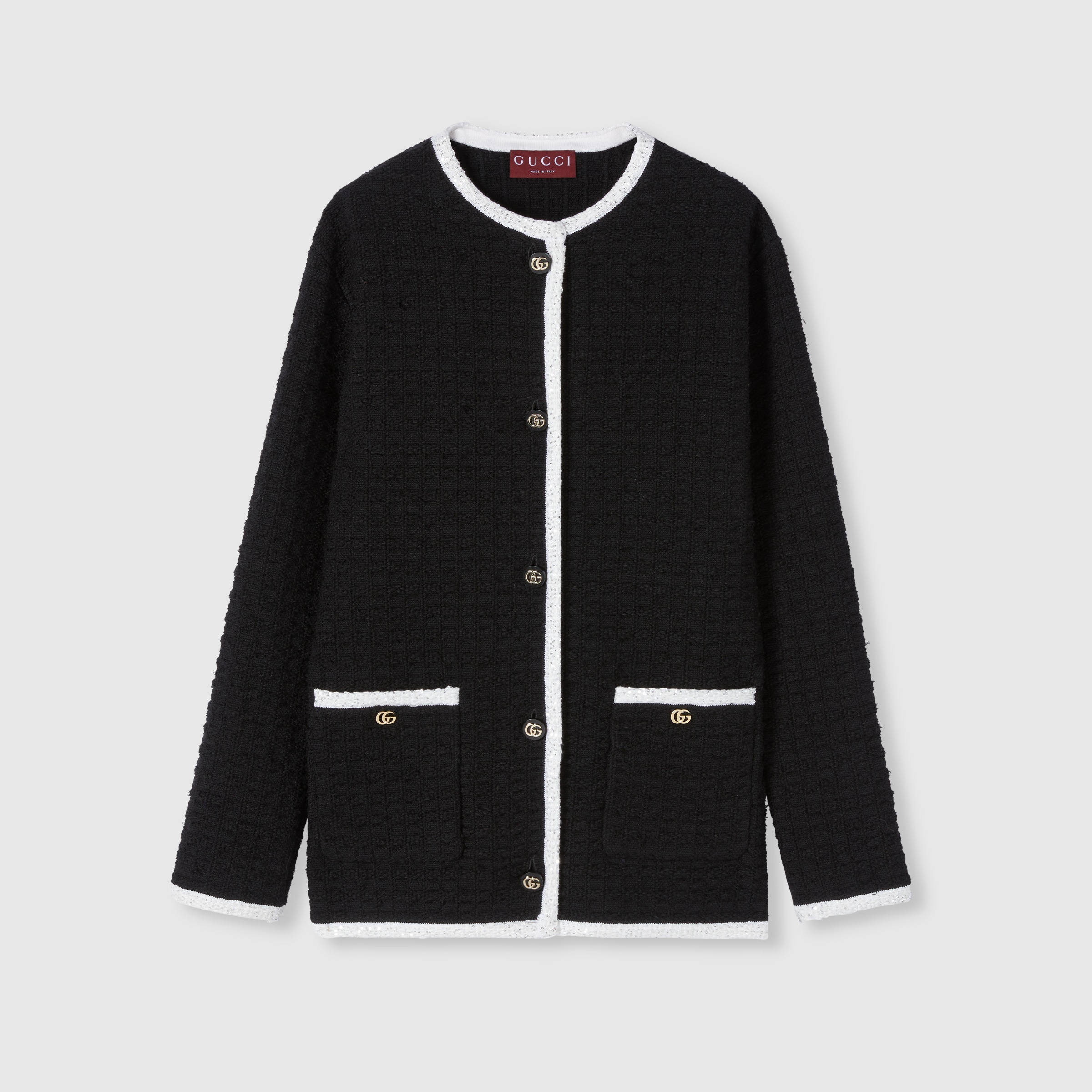 Coats, jackets, and dresses blend discreet elegance with refined details in the Pre-Fall 2025 collection. This soft tweed wool cardigan with a bon-ton feel is enriched with a sequin embroidered trim and gold-toned Double G buttons. - Black and white soft tweed wool - Sequin embroidered trim - Self-covered gold-toned Double G buttons - Crewneck - Two front pockets - Button closure - Made in Italy