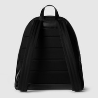 Introducing Spring Summer 2026. New soft leather designs combine functional versatility and multiple wearabilities. The revisited Web intarsia detail further elevates the style. - Black soft leather - Silver-toned hardware - Black canvas lining with Diamante motif - Adjustable padded shoulder straps - Padded mesh back - Web intarsia and "Gucci Made in Italy" logo - Inside: 1 zip pocket - Outside: 1 zip pocket - Zip closure - 14.3"W x 16.1"H x 7"D - Weight: 3.3lbs, approximately - Made in Italy - Fits up to a 13" laptop, iPad, A4 notebook, and small items
