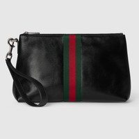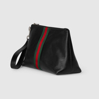 Introducing Spring Summer 2026. The focus on refined leather is highlighted through new soft small leather goods. This style combines functional versatility and the revisited Web detail which further elevates the design. - Black soft leather - Silver-toned hardware - Black canvas lining with Diamante motif - Web - Detachable leather handle - Inside: 1 zip pocket - 5.9" handle drop - Zip closure - 10.4"W x 6.1"H x 4.1"D - Weight: 0.7lbs, approximately - Made in Italy - Fits iPhone, Airpods, wallet and small items