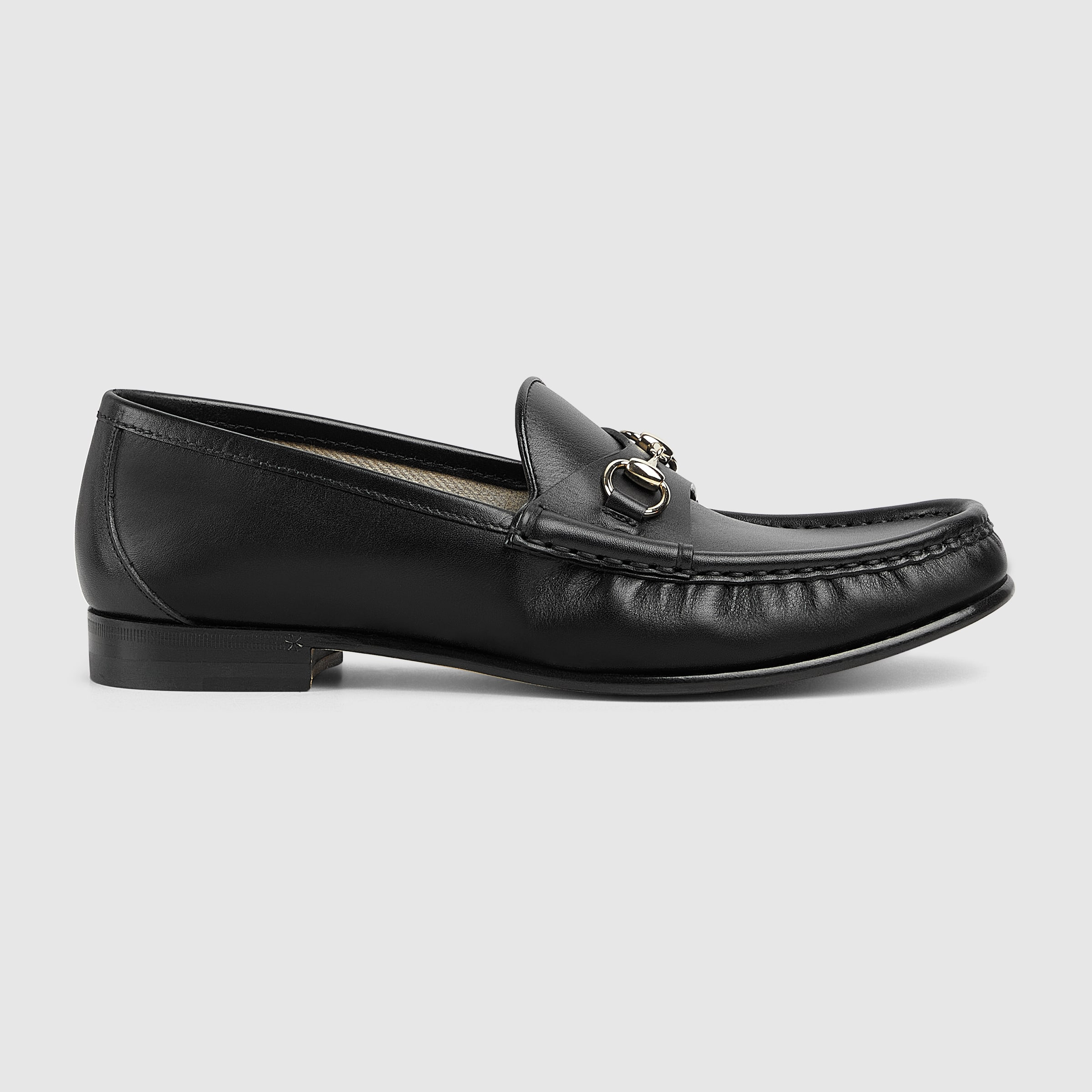 One of the House's most signature styles, the Gucci loafer is presented here crafted in refined leather. The rounded shape mixes with a gold-toned Horsebit piece as a tribute to Gucci's heritage. - Black leather - Women's - Light gold-toned hardware - Leather lining - Horsebit - Flat - Height: 0.5" - Made in Italy