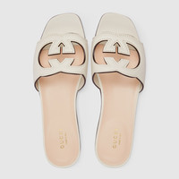 Influenced by an archival design from the '70s-a hallmark era of the House, the Interlocking G appears as a maxi cut-out detail atop this white leather sandal. An ode to timeless elegance, the Gucci Love Parade collection explores archival symbols in new ways. - White leather - Women's - Interlocking G cut-out - Leather sole - Flat - .4" heel height - Made in Italy