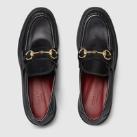 Gucci continues to feature archival symbols. For the latest collection, the Horsebit hardware recalls the House's equestrian heritage. This pair of women's loafers is crafted in leather and defined by a rubber lug sole. - Black leather - Women's - Light gold-toned hardware - Horsebit - Rubber lug sole - Flat - Height: 1.7" at the back, 0.9" at the front