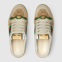 Influenced by classic sneakers from the 1970s, the Screener sneakers is named for the defensive sports move. This mule variation appears in beige leather. The green and red Web stripe on the side and the vintage Gucci logo complete the style. - Beige leather - GG canvas trim - Green and red Web - Oval enameled detail with metal Double G - Label with Gucci vintage logo - Bi-color flatform sole - Additional pair of laces included - Low heel - 1.9" heel height - Made in Italy