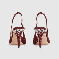 This shoe features multi-dimensional crystals as a special feature on the classic silhouette. The emblematic Horsebit adds a touch of timeless elegance, highlighting the brand's heritage. Carefully crafted, this design effortlessly combines luxury and bold style, making it a true statement piece. - Gucci Rosso Ancora red GG canvas - Light gold-toned hardware - Horsebit - Multi-dimension crystals detail - Leather sole - Pointed toe - Adjustable buckle closure - Mid-heel - Height: 3.3" - Made in Italy