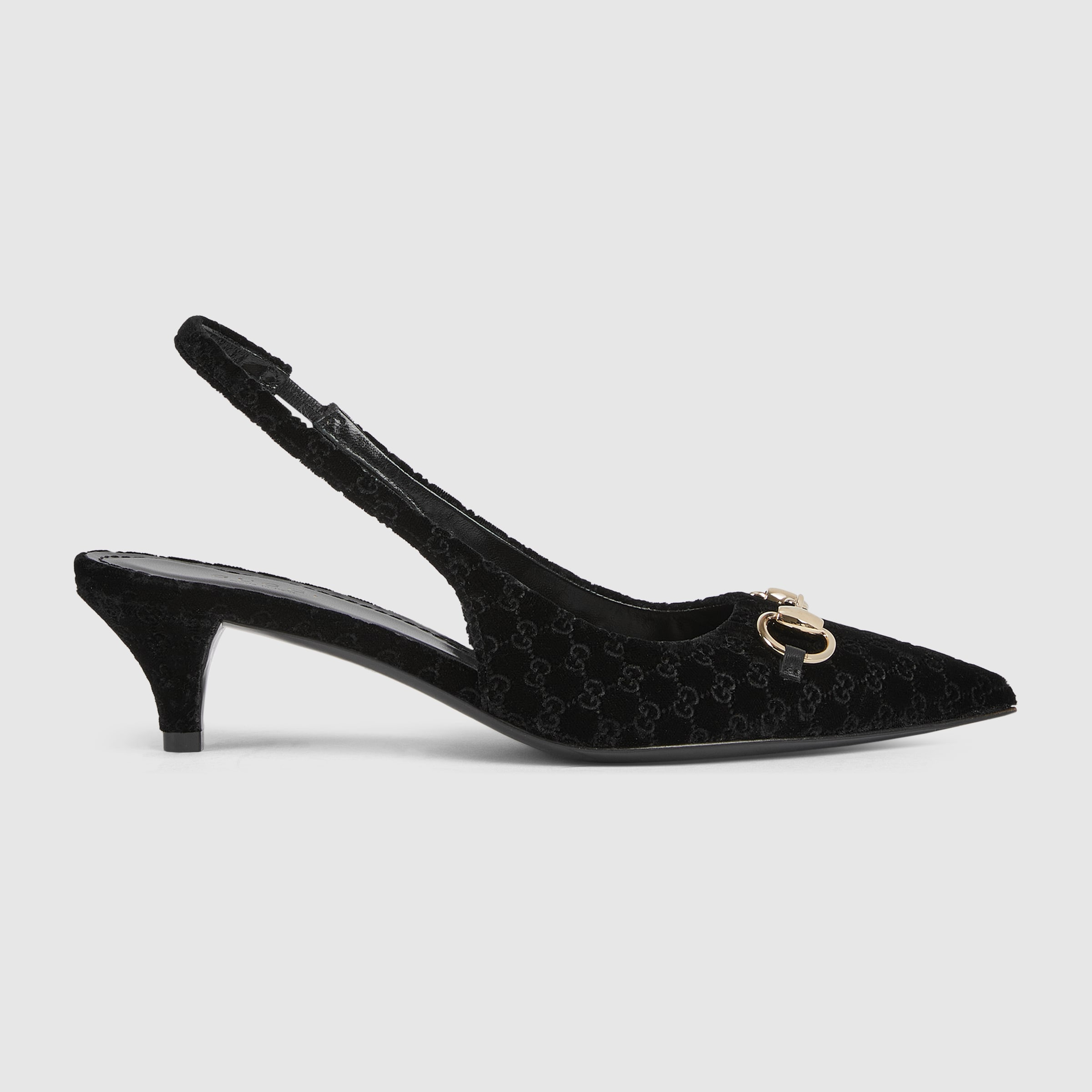 Crafted from smooth GG velvet, this women's pump is defined by a sleek pointed toe and a Horsebit detail—an homage to Gucci's equestrian heritage. The polished finish and iconic hardware reimagine a classic silhouette through a contemporary lens, - Black GG velvet - Light gold-toned hardware - Horsebit - Leather sole - Adjustable ankle closure with buckle - Low heel - Height: 1.7" - Made in Italy