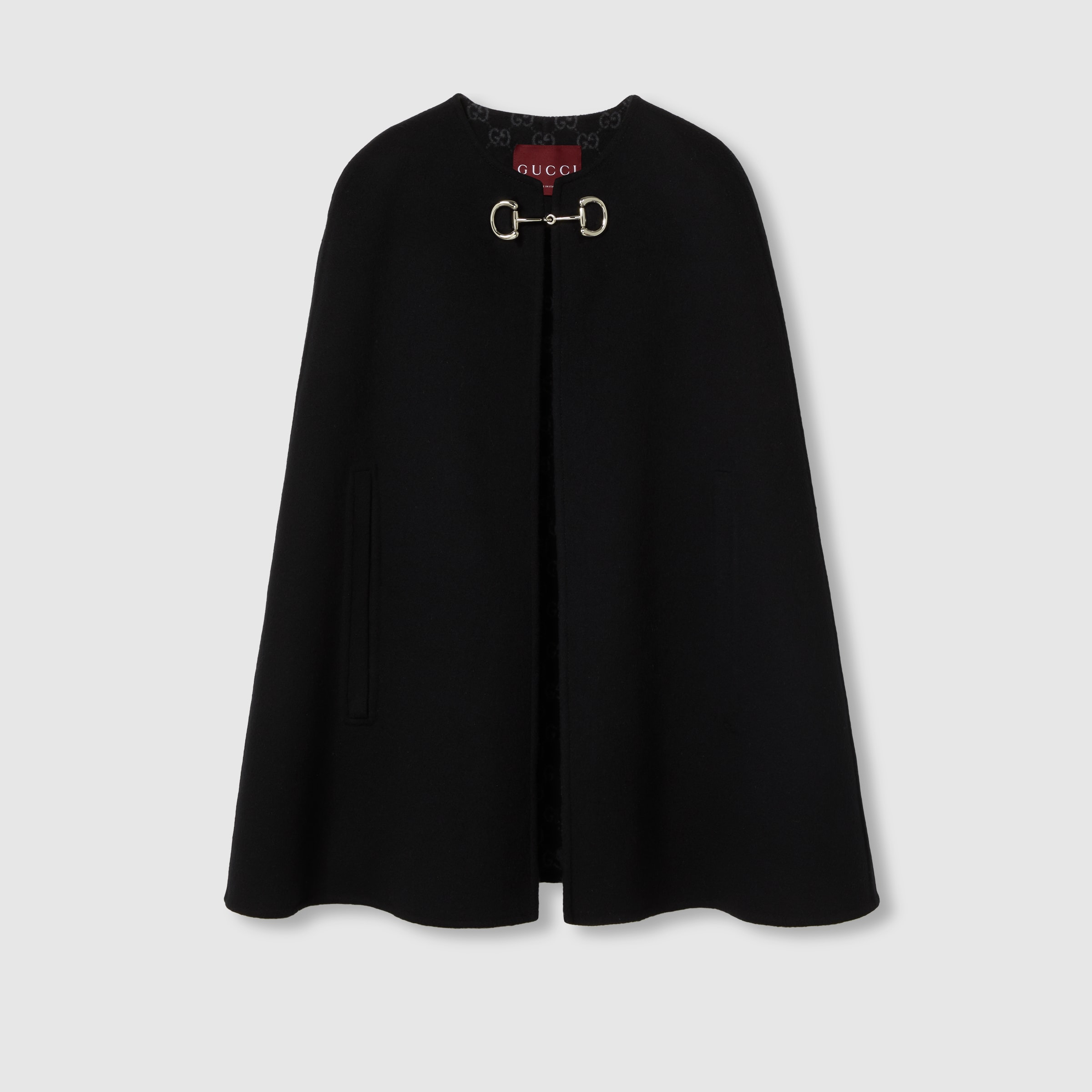 The Gucci Cruise 2025 collection features minimalist garments in either total white or total black, introducing finely constructed pieces in an essential palette. Crafted from a double faced wool and silk fabric, this voluminous cape is defined by a silver-toned Horsebit closure. - Black and grey double wool and silk - Unlined - Collarless - Closure with Horsbit hardware - Made in Italy - The product shown in this image is a size 40 (IT)