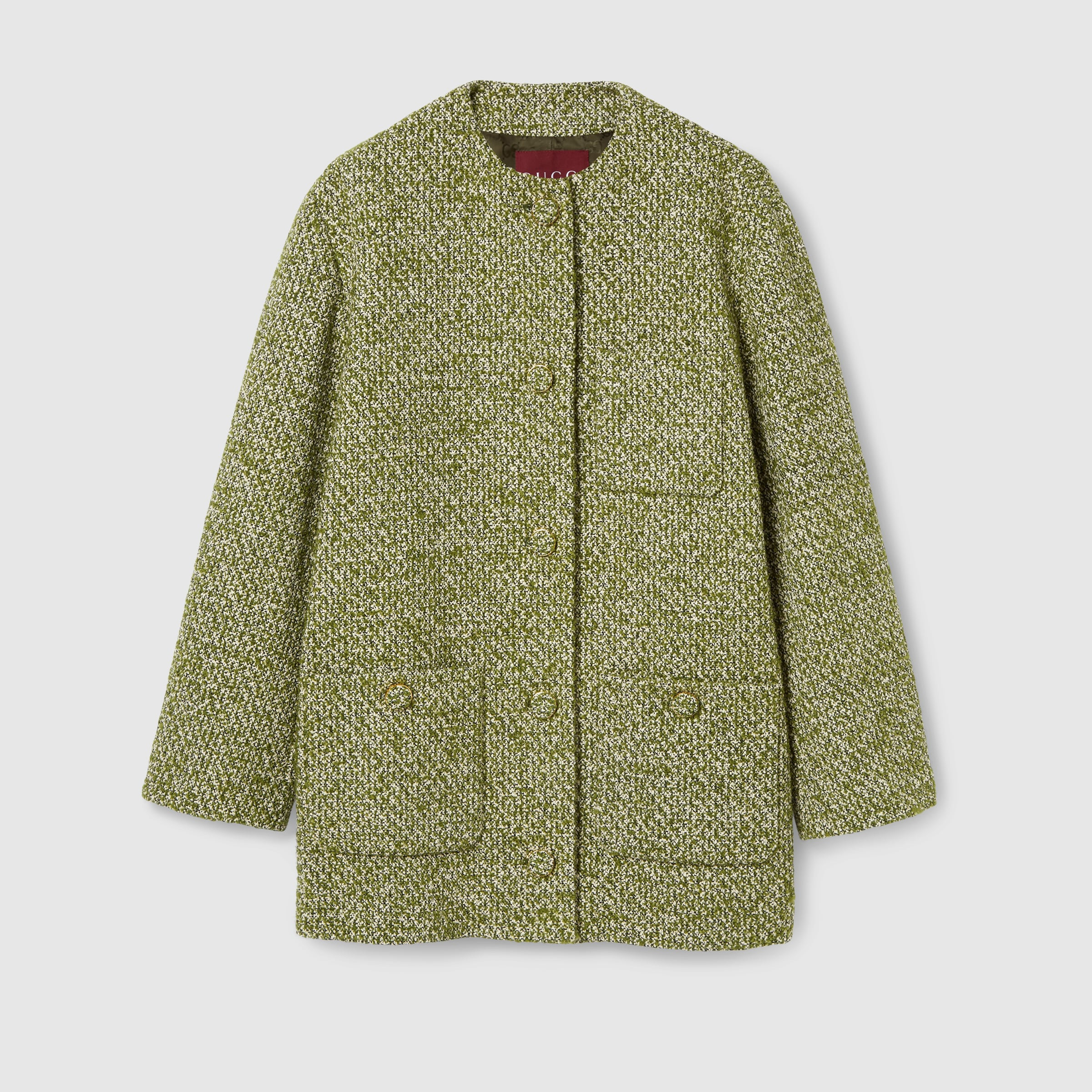 In the Fall Winter 2025 collection, refined proportions and textured materials define essential silhouettes. This lined jacket features a crewneck, front button closure and patch pockets. - Green and ivory wool cotton boucle - Lined - Crewneck - Two front patch pockets - Length: 18.9"; based on size 40 IT - Made in Italy