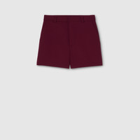 Equestrian symbols embellish signature silhouettes with a vibrant touch. Crafted from wool crepe, these shorts are defined by a Gucci logo embroidery. - Gucci Rosso Ancora red wool crepe - Gucci embroidery - Belt loops - Two side pockets - Back pockets - Tab and zip fly closure - Length: 13.7"; Hem width: 24.4" - Fabric: 100% Wool - Lining: 100% Viscose - Embroidery: 100% Polyester