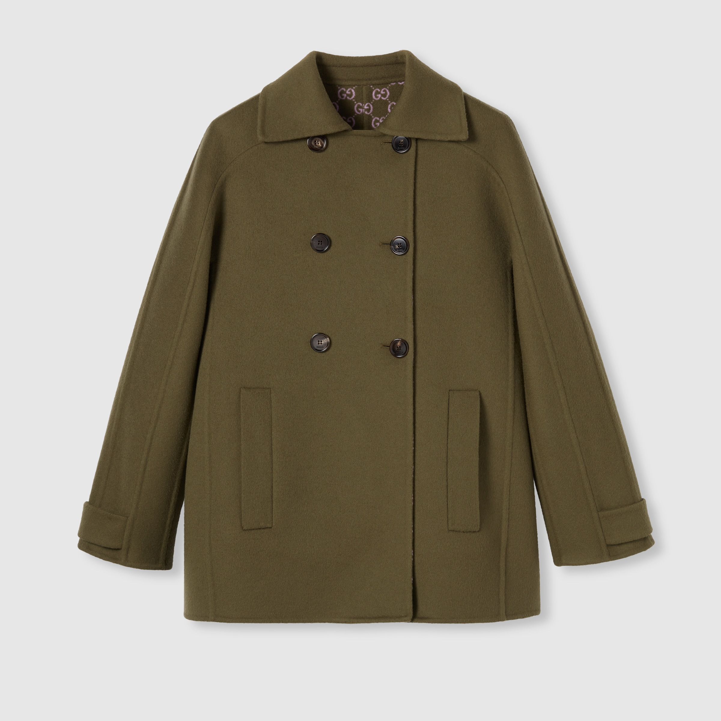 Green defines the color narrative for Pre-Fall 2025 and speaks volume with textures, logo details and varying tonalities, as seen on the runway. This double-breasted coat is in wool with a GG interior. - Dark green wool - GG lining - Point collar - Double-breasted - Two side pockets - Button closure - Made in Italy
