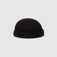 In the Fall Winter 2025 collection, this striking hat is stated in wool and reveals a contrasting Gucci embroidery. - Black wool - Gucci embroidery - Unlined - Web detail - Adjustable buckle closure