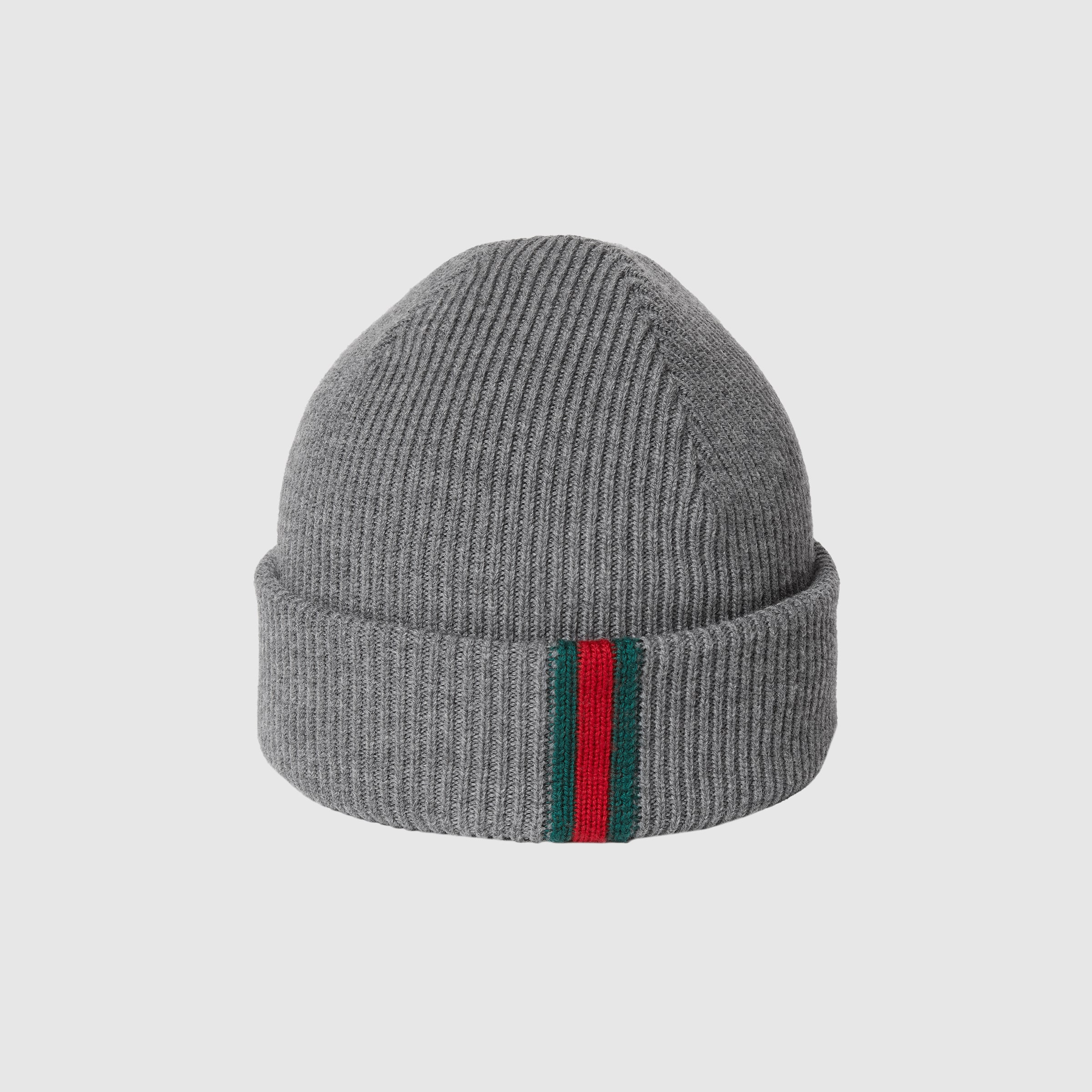 The Pre-Fall 2025 soft and silk accessories collection animates House codes through sophisticated trimmings, logo patches and subtle embroideries. This beanie hat is presented in grey wool with a green and red Web detail. - Grey wool - Web detail - Made in Italy