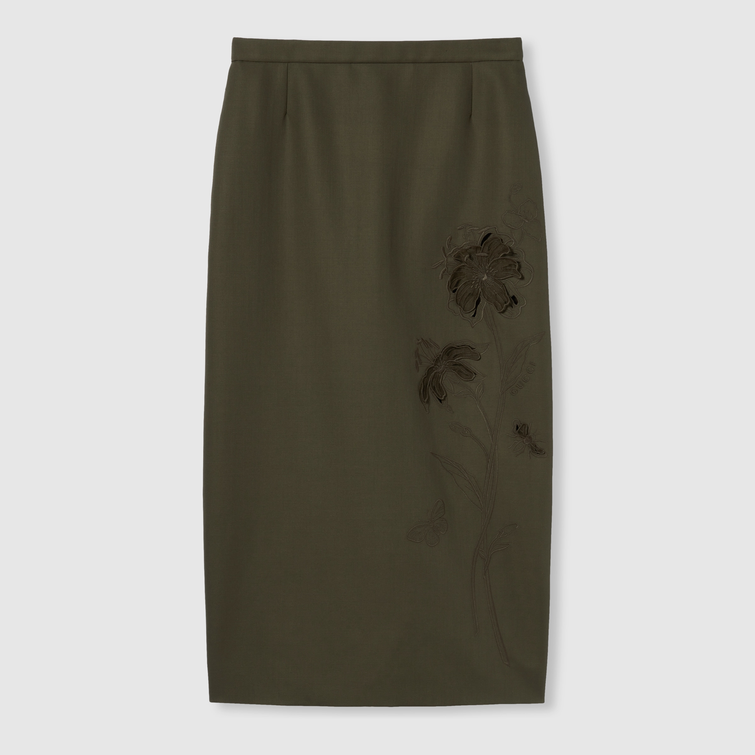 The Pre-fall 2025 collection introduces a new take on warm materials on sophisticated outerwear pieces, in traditional and contemporary silhouettes. This skirt with a balck slit appears in a wool mohair and is complete with a delicate Gucci floral embroidery. Can be paired with a matching top. - Dark green wool mohair - Gucci floral embroidery - Detachable lining - Front and back darts - Back slit - Zip closure - Made in Italy