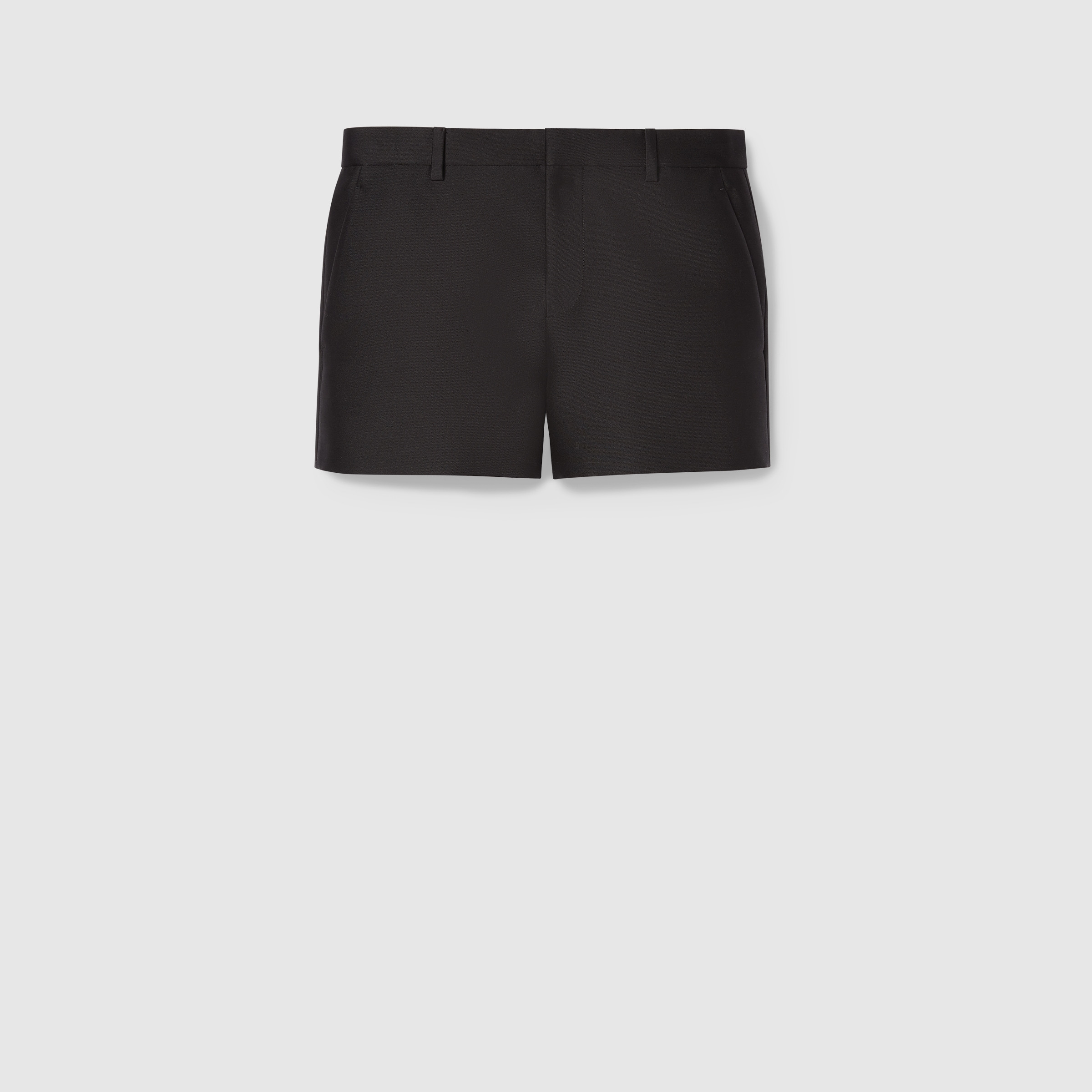 The piece is part of Sabato De Sarno's debut collection, offering a modern take on the House's well-known codes and symbols. Crafted from a blend of wool and silk gabardine, this pair of shorts is designed with a low waist and an internal tape belt that recalls the traditional sartorial pants. The piece is completed with two side and two back pockets and belt loops. - Black wool silk gabardine, with a slightly shiny surface - Lined - Internal tape belt - Low waist - Two side pockets - Two back pockets - Belt loops - Tab and zip closure - Leg opening: 12.2" , based on a size 40 (IT) - Length: 12.5" , based on a size 40 (IT) - Made in Italy - The model is 5'8" and is wearing size 40 (IT)