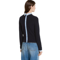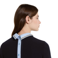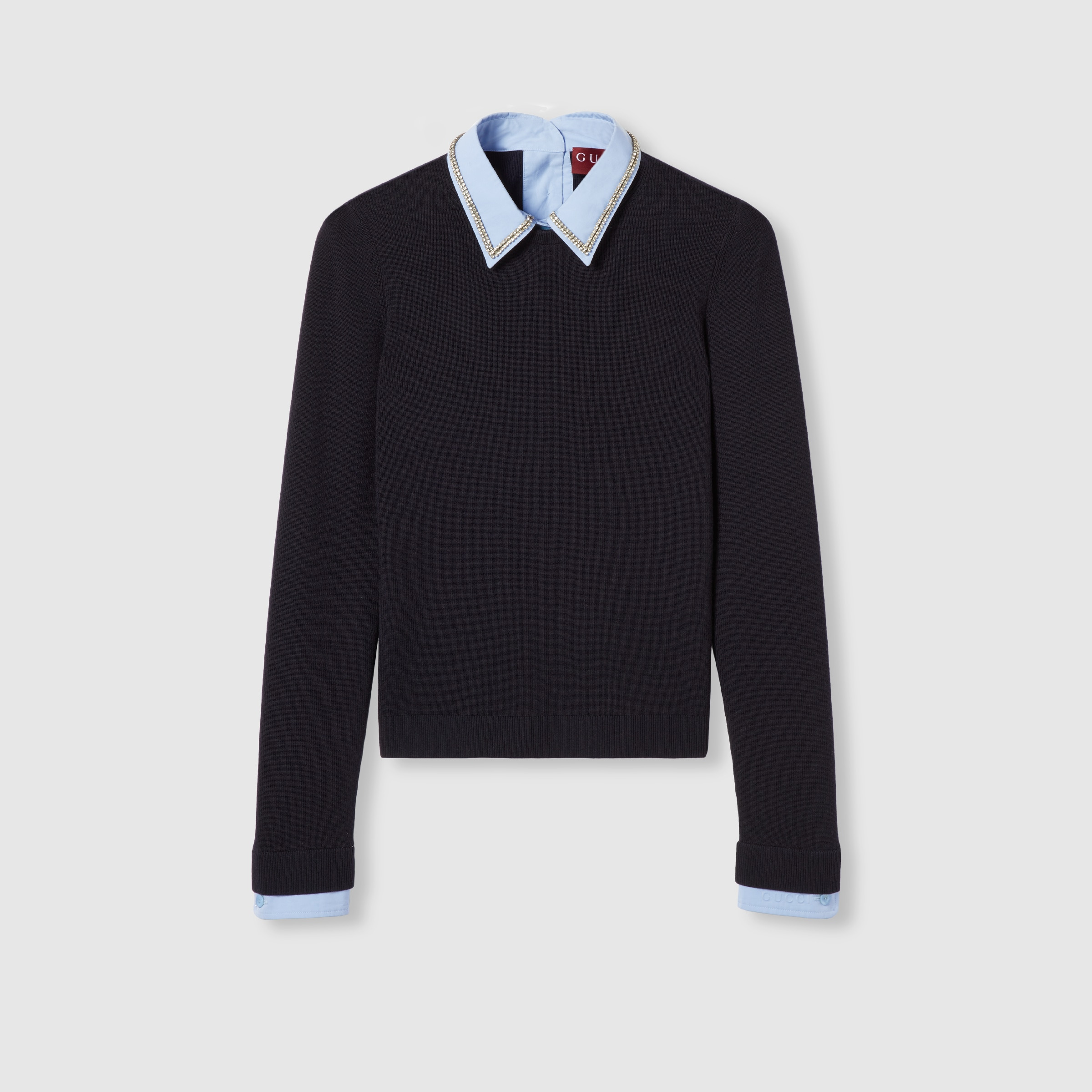 Coats, jackets, and knitwear pieces blend discreet elegance with refined details in the Pre-Fall 2025 collection. This unique piece combines a sweater style with shirt detailing in cotton poplin, a crystal embroidery defines the collar. - Navy wool - Contrast cotton poplin details - Embossed Gucci logo - Point collar with crystal embroidery - Rib trim - Button closure - Made in Italy