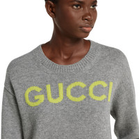 The Gucci logo appears in unexpected colors and fabric combinations, from linen blend to wool. This crewneck top is presented in a grey wool and enriched with a 'Gucci' intarsia. - Grey wool - Gucci intarsia - Crewneck - Dropped shoulder - Long sleeves - Rib trim - Shoulder drop: 18.5 " based on a size S (IT) - Sleeves Length: 21.2 " based on a size S (IT) - Regular fit - Length: 21.6 " based on a size S (IT) - Made in Italy - Hem Width: 48cm, based on a size S