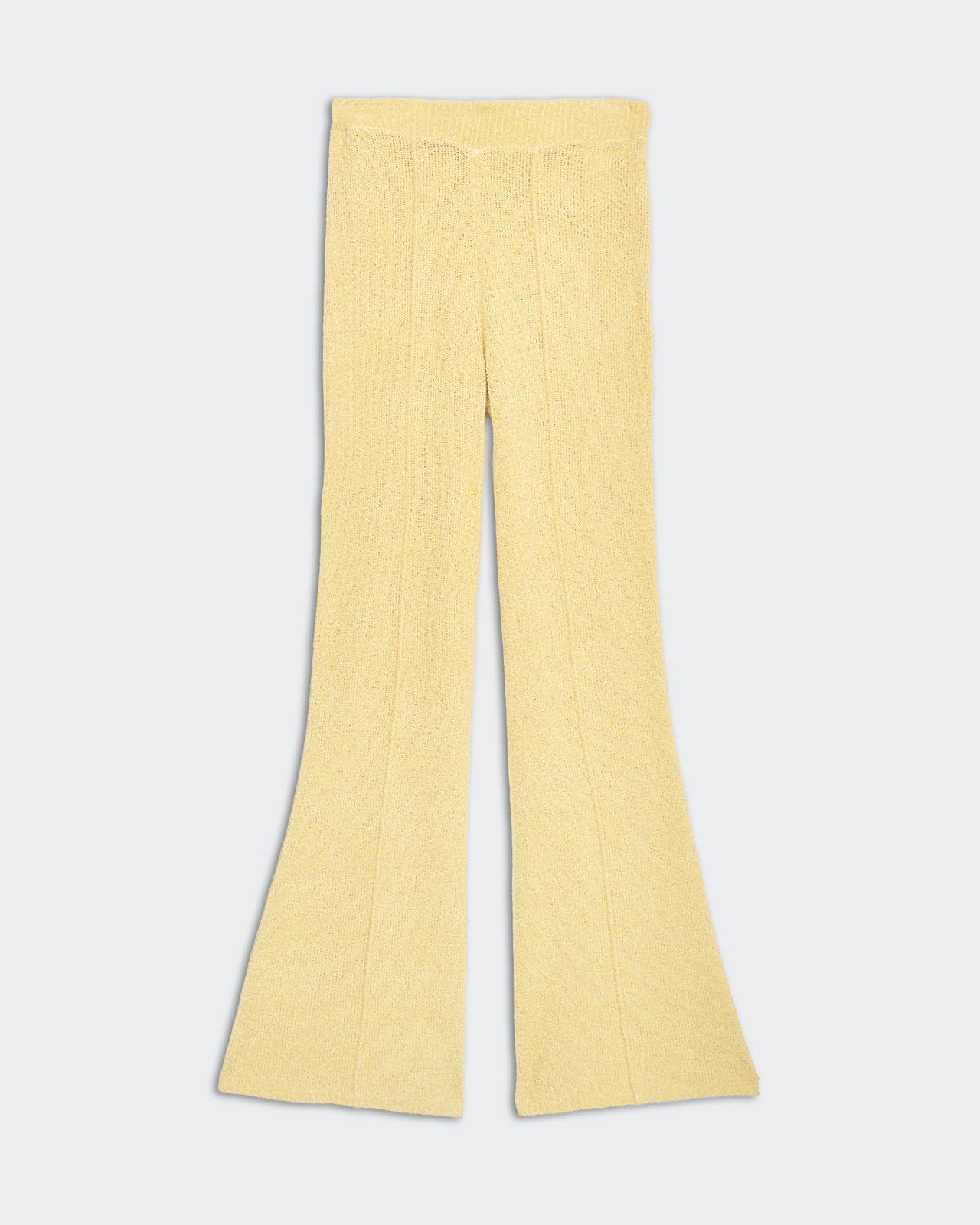 - MIDWEIGHT BOUCLE FLARE PANT - PIN TUCK AT CENTER LEG FRONT AND BACK - ELASTICATED RIB WAISTBAND - FULL LENGTH - 85% ORGANIC COTTON, 15% POLYESTER - ELLA IS 5' 11" / 180 CM and is wearing a small.