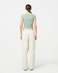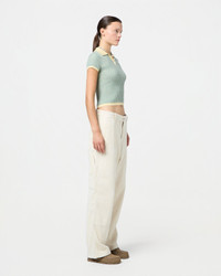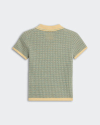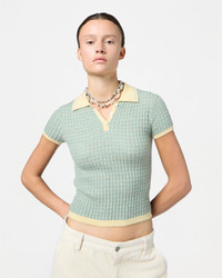 - Feather-weight short-sleeve rib polo - Rib polo collar - Three-button half placket closure - Rib hem and cuff trim - Fine three-color chevron striping - Signature gir branding at center back - 18 gauge - 100% cashmere - ELLA IS 5' 11" / 180 CM and is wearing a small. - Premium cashmere sourced from inner Mongolia, manufactured in China
