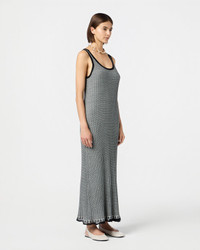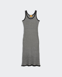 - FINE WEIGHT RIB STRIPED TANK DRESS - A LINE, ANKLE LENGTH - SOLID COLOR JERSEY ROLL TRIMMING AT NECK AND ARMHOLE - SPECIAL LACE GINGHAM STITCH DETAIL AT HEM - Signature GIR branding at center back - 70% SILK 30% LINEN BLEND - ELLA IS 5' 11" / 180 CM AND IS WEARING A SMALL.